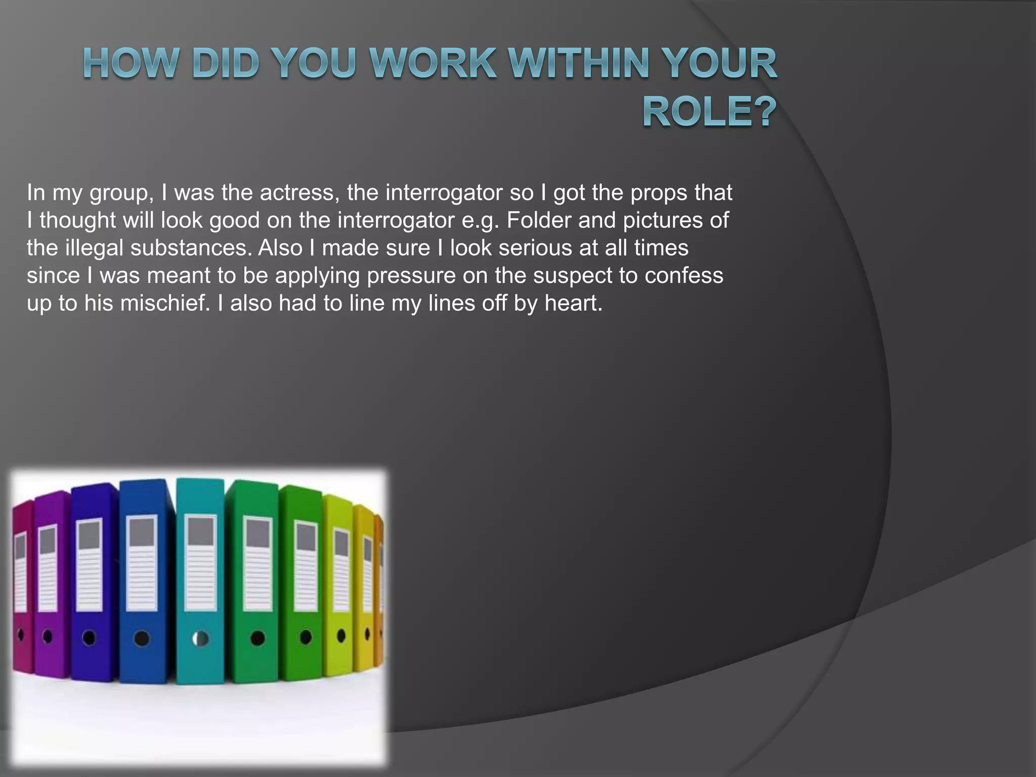 The document summarizes the author's experience participating in a group project where they played the role of an interrogator. As the interrogator, the author gathered props like folders and photos. They had to memorize their lines but sometimes faced delays that made learning challenging. Overall, the group worked well together with no disagreements. The most difficult part for the author was learning lines and staying serious while acting. Going forward, the author wants to improve their time management, memorization skills, getting into character, and filming techniques.
