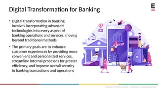 Digital transformation in banking incorporates advanced technologies to enhance customer experiences, improve efficiency, and strengthen security. Key components include digital channels, data analytics, AI and machine learning, blockchain, and cloud computing, contributing to a projected market growth from USD 68.2 billion in 2022 to USD 310.6 billion by 2031. The banking sector leads this shift, driven by customer-centric innovations and the integration of technology.