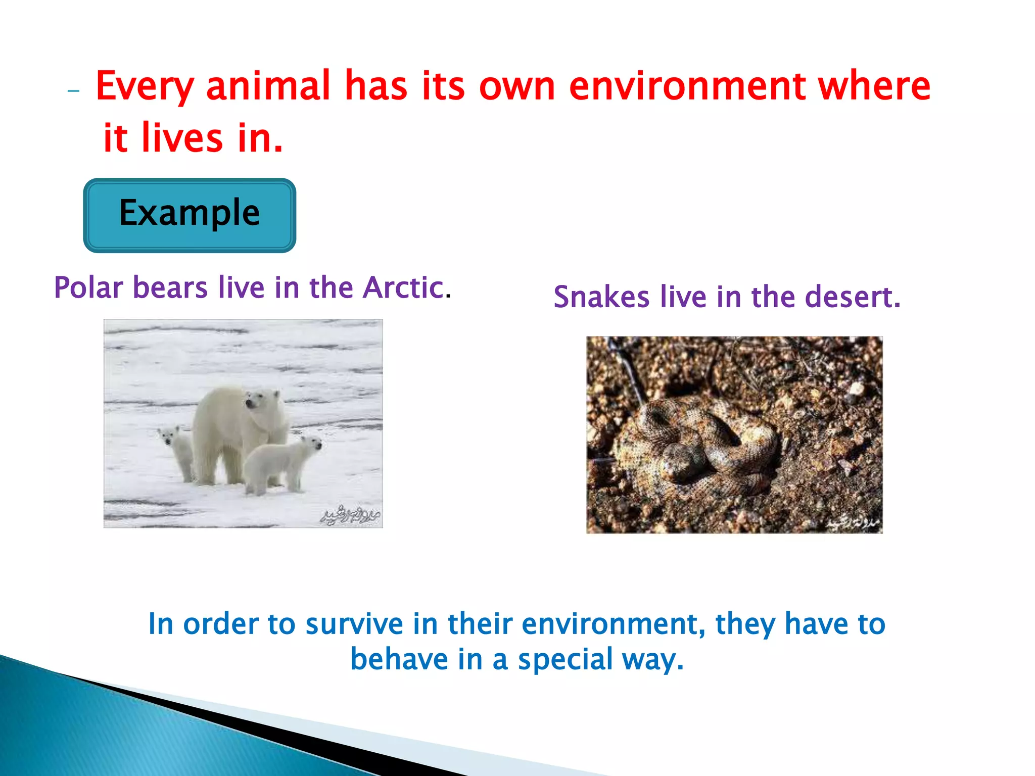 Animals adapt in different ways to survive in their environments. Some camouflage by blending in with their surroundings, like polar bears and chameleons. Desert animals adapt through traits like long ears and underground roots. Forest plants have drip tips or large leaves to cope with rainfall or lack of sunlight. Animals use mimicry, hibernation, stinky sprays or migration. Ocean life adapts through structures that provide flotation, lighting or attachment to surfaces. Wetland plants and animals evolve traits suited to their muddy soil or ability to move between land and water.