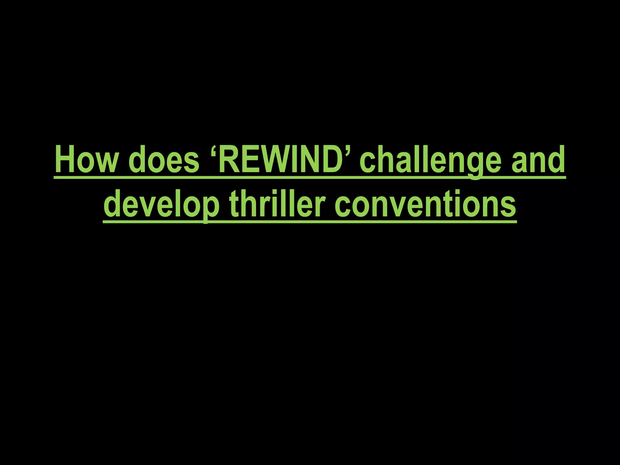 This document analyzes how the movie "REWIND" challenges thriller conventions by also fulfilling conventions of horror movies. It identifies several conventions used in "REWIND" that are typical of both horror and thriller genres, such as fast editing during shock scenes, slow cuts when building tension, ominous settings, use of silence and music to increase anxiety, and costumes that symbolize death. The document concludes that through its use of flashing shots and flashbacks, "REWIND" fulfills the horror convention of disorienting the audience to build tension.