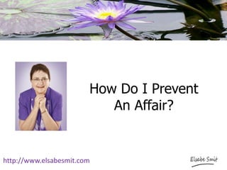The document discusses how to prevent having an affair. It notes that all relationships have a duration and depend on how the parties manage the relationship over time. Sometimes people end relationships emotionally or mentally before physically leaving. To prevent an affair, one should be honest when a relationship ends rather than being unfaithful. Having clear values of faithfulness and finding a partner with similar values can also help prevent infidelity.