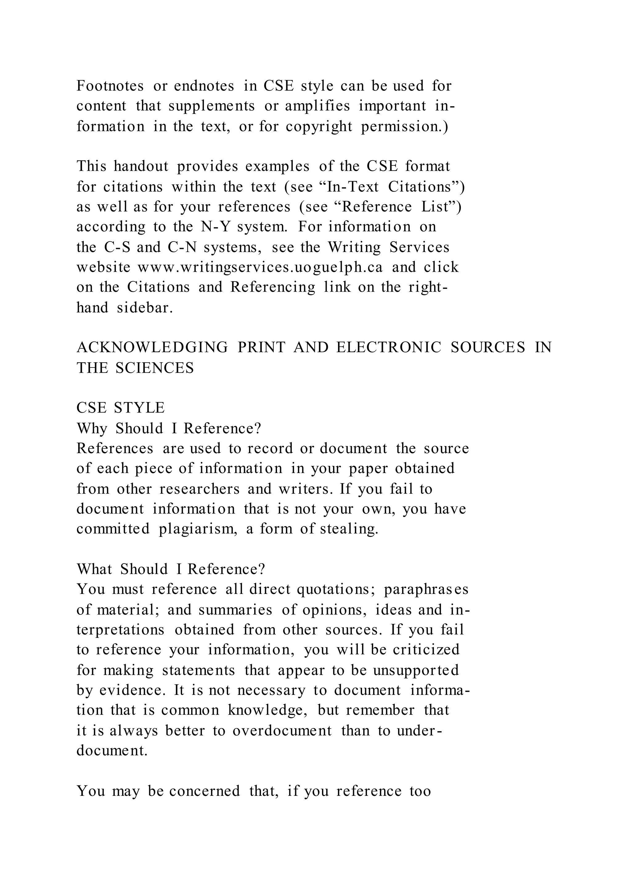This document provides guidance on three citation styles - Name-Year (N-Y), Citation-Sequence (C-S), and Citation-Name (C-N) - that can be used in a CSE style paper. It explains that the N-Y style includes the author and year in parentheses in the text and lists references in alphabetical order. The C-S style uses superscript numbers in the text and lists references numerically. The C-N style lists references alphabetically and uses superscript numbers to cite them in the text. The document provides examples of how to format in-text citations and reference list entries for various sources like books, articles, websites and unpublished materials for the N-Y system.