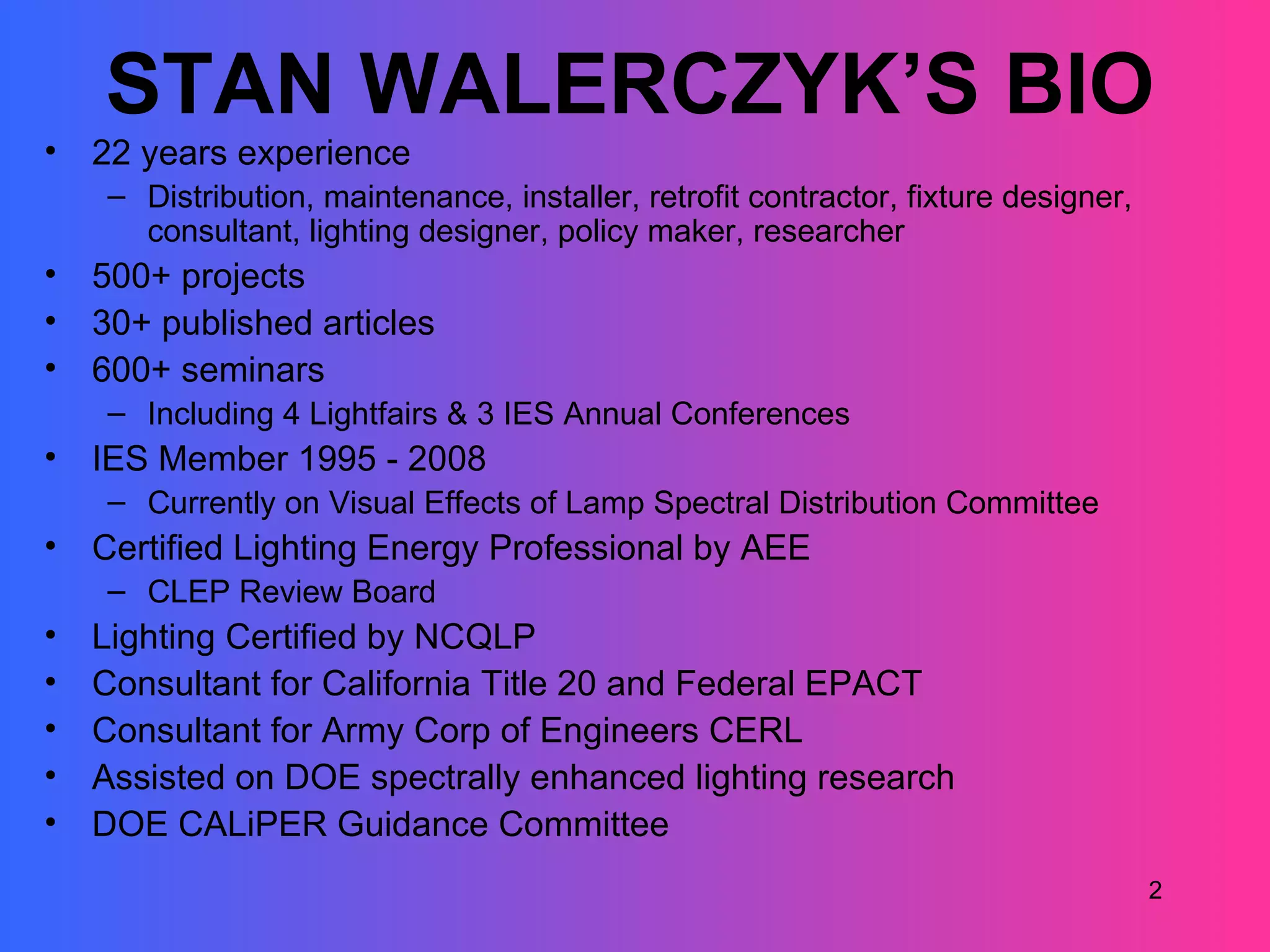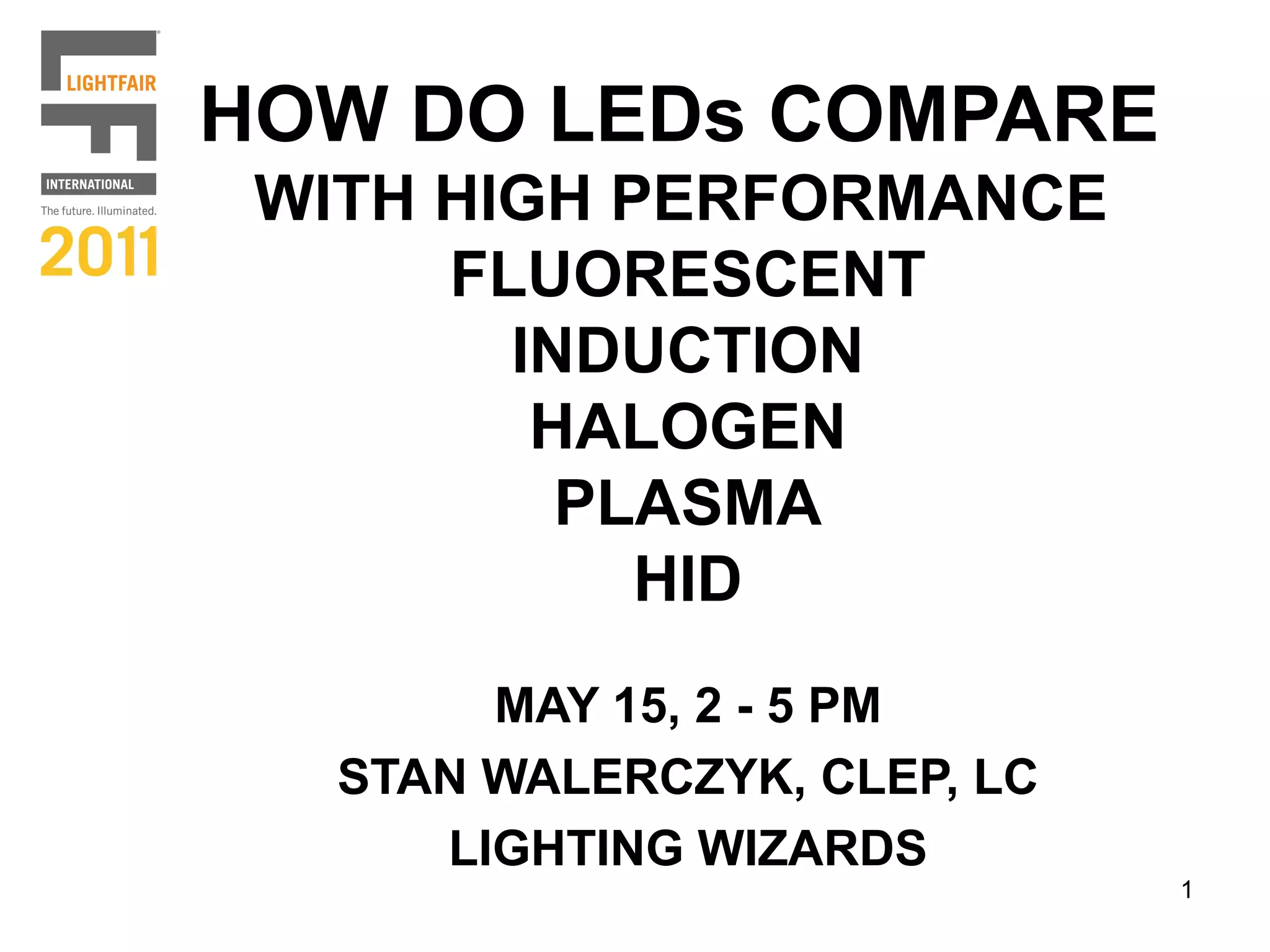 Stan Walerczyk presented on how LEDs compare to other lighting technologies like fluorescents, halogens, and HID lights. He discussed key points like LED performance claims not always matching testing results, the need for proper thermal management of LEDs, and uncertainties around long-term projections for LED performance and costs. He emphasized evaluating LED products thoroughly based on testing data and manufacturer reputation before specifying them for projects.