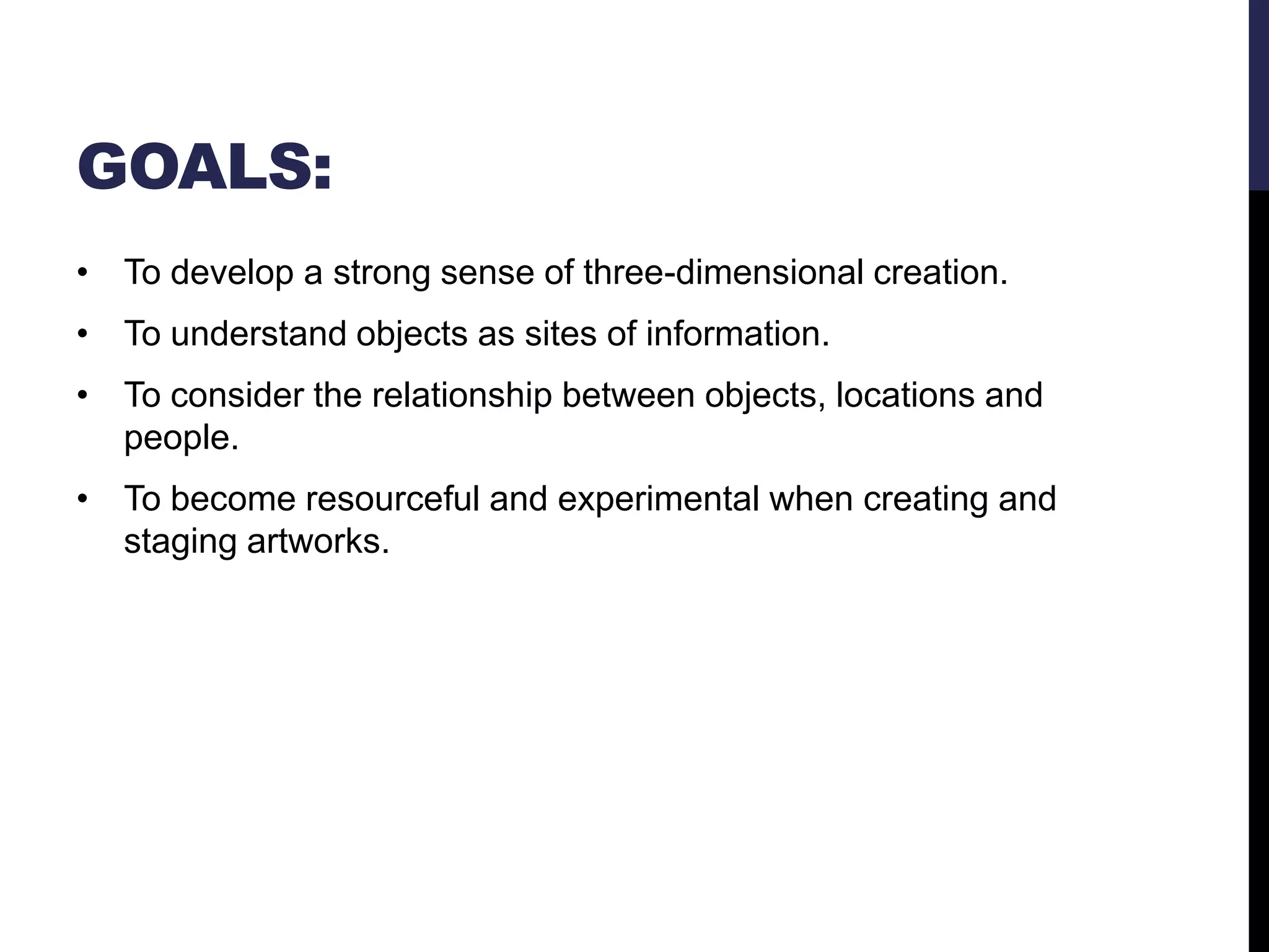 This document outlines the goals, schedule, assessments, and resources for a course on objects and installation. The course aims to develop students' understanding of objects as sites of information and their relationship to locations and people. Over six weeks, students will complete assignments involving found objects, clay work, yarn bombing, and creating cyborg-inspired works using papier-mache and found objects. Students must submit a portfolio of their work for assessment. The document provides the course website which contains schedules, assignments and tutorials to support students' learning.
