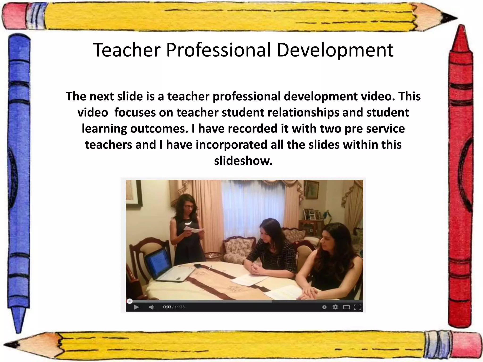This document summarizes a teacher professional development session focused on the impact of positive student-teacher relationships on student learning outcomes. The session discussed research showing relationships influence motivation, engagement and outcomes. Teachers were asked to observe each other and assess relationships. Strategies were presented to strengthen relationships, such as self-disclosure, responsibility assignments, and goal setting. Overall, the session aimed to raise awareness of the importance of relationships and provide ideas to improve them.