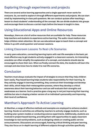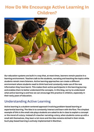 The document discusses the importance of active learning in education, emphasizing the need for student-centered approaches that encourage engagement and critical thinking. It outlines various methods to promote active learning in children, including experiential learning, group discussions, and linking lessons to real-life scenarios. The document highlights the benefits of such approaches, including improved learning abilities, self-evaluation, and personal development.