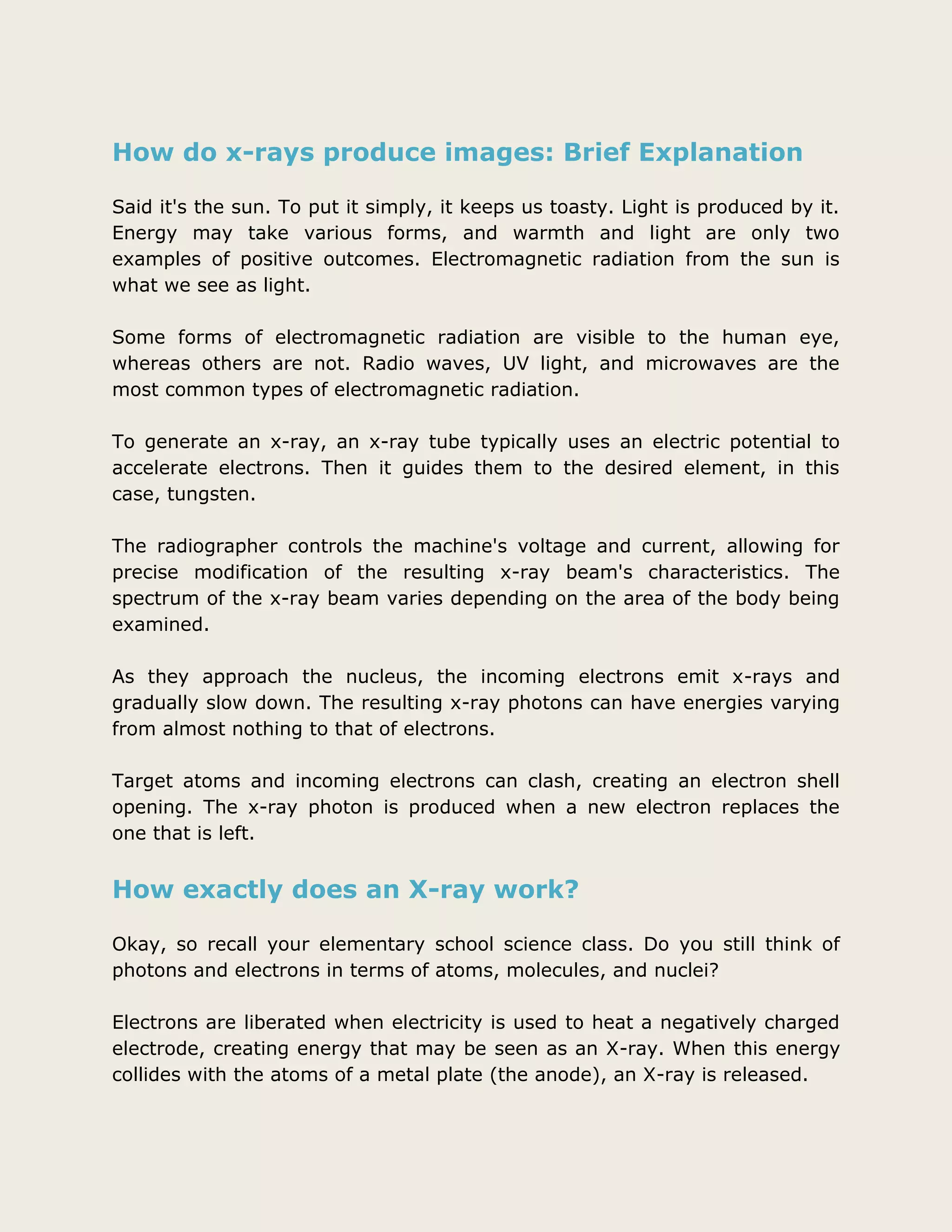X-rays produce images of the body's internal structures by using electromagnetic radiation to penetrate soft tissues while being absorbed by denser materials like bones. This process involves accelerating electrons within an x-ray tube, which emit x-rays when they collide with a metal plate. X-rays are widely used in medical and dental settings for diagnosing various conditions, with a minimal risk of radiation exposure linked to cancer.