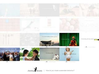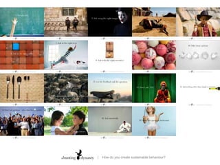 The document discusses strategies for fostering sustainable behavior through various methods such as social norms, feedback mechanisms, and commitments. It highlights examples from initiatives encouraging practices like towel reuse in hotels, energy consumption awareness, and washing clothes at lower temperatures. Emphasis is placed on creating a supportive environment that influences individuals' decisions without direct questioning.