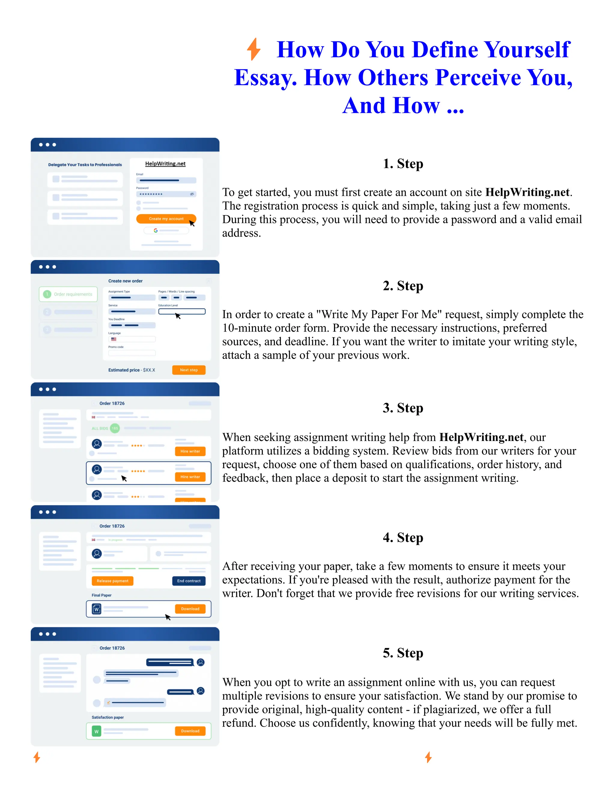 The document provides instructions for requesting writing assistance from HelpWriting.net. It outlines a 5-step process: 1) Create an account with an email and password. 2) Complete a 10-minute order form with instructions, sources, and deadline. 3) Review bids from writers and select one based on qualifications. 4) Review the completed paper and authorize payment if satisfied. 5) Request revisions until fully satisfied, with a refund option for plagiarized work.