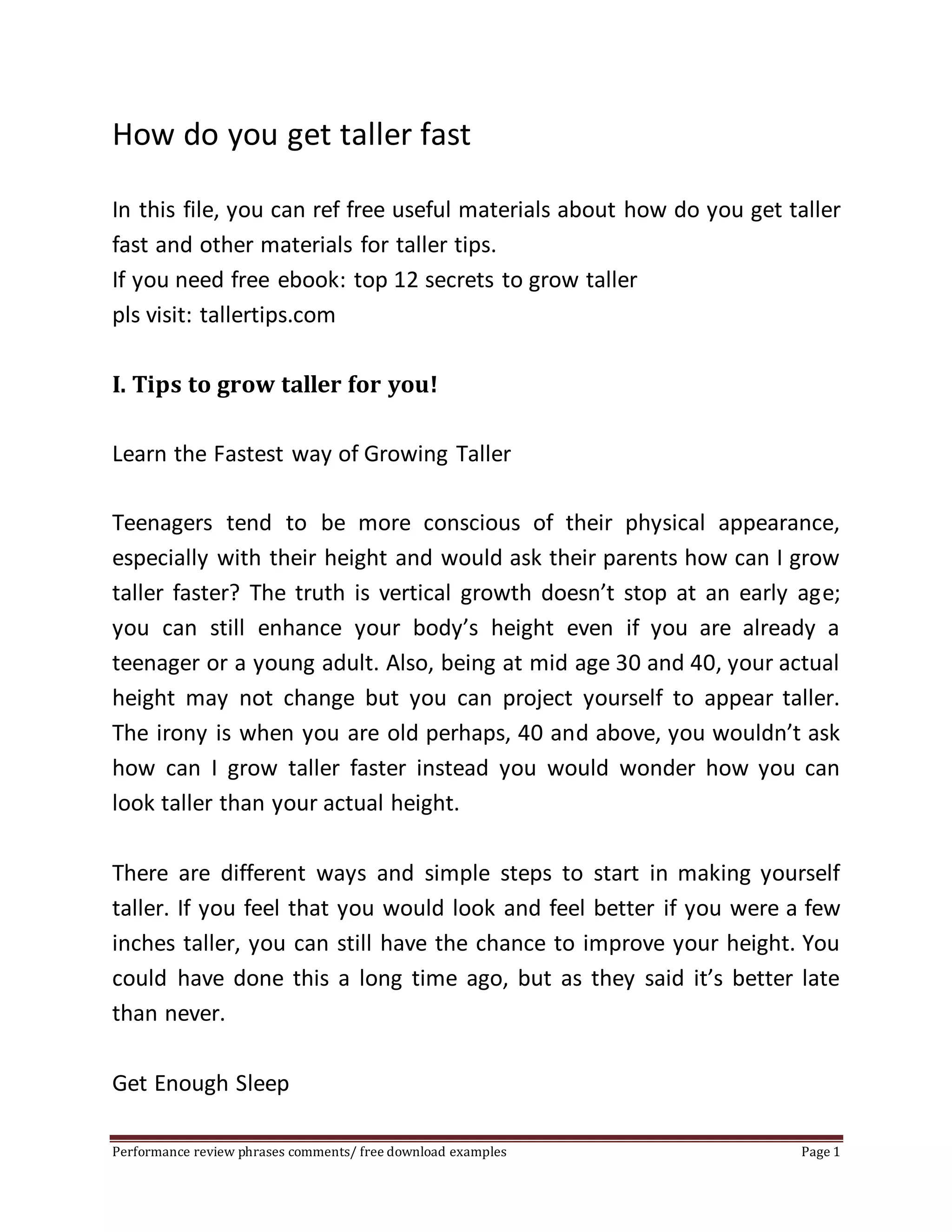 The document provides tips for how to get taller faster, including getting enough sleep, eating a diet rich in protein, iron and calcium, exercising, and maintaining healthy levels of growth hormones. Adequate sleep is important as it allows the body to take advantage of growth hormones to extend and repair bones and tissues. Exercise and stretching can also help increase height modestly. Genetics are also a major determinant of height.