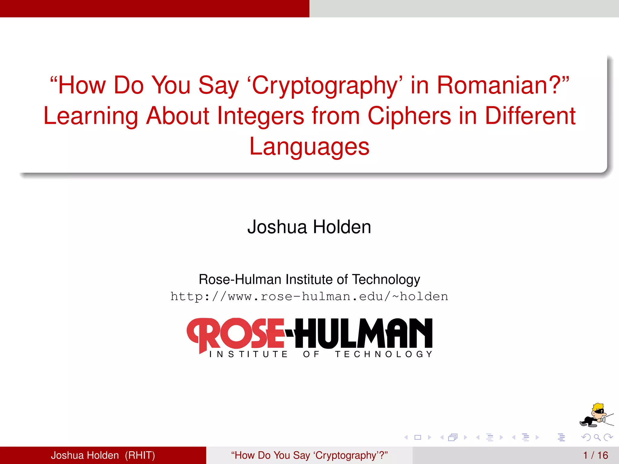The document discusses decimation ciphers and how they relate to modular arithmetic. It explains that a decimation cipher is a type of multiplicative cipher where each letter is multiplied by a key modulo the number of letters in the alphabet. Only certain keys work well, namely those relatively prime to the alphabet size. The document explores this concept for different languages and their alphabets.