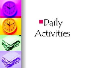 The document outlines daily activities and time expressions, detailing a typical day's routine from waking up to going to bed. It also explains how to express time using different phrases such as 'at,' 'in,' and 'on,' and provides examples and exercises to practice these concepts. Additionally, it includes various time expressions related to daily activities and suggests using these in context.