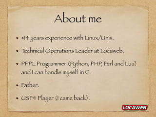 The document explains how shared web hosting environments work, specifically detailing Locaweb's approach and infrastructure. It outlines the advantages of shared hosting, including automation and scalability, and describes the various technologies and architectures employed in their services. Additionally, it provides an overview of Locaweb's history, employee and customer statistics, and mentions key programming languages and security measures used.