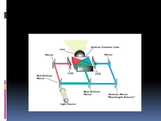 Projectors work by using different technologies to project images or video onto a screen. The main types are CRT, LCD, DLP, and LCOS. CRT projectors use electron guns and phosphors to create images. LCD projectors use backlights and liquid crystal panels to control light transmission for each pixel. DLP projectors use an array of microscopic mirrors to rapidly reflect light and form images. LCOS projectors are similar to LCD but use reflective silicon backplanes instead of glass for better image quality. All projector types work by precisely controlling light to reproduce colors and create projected pictures.