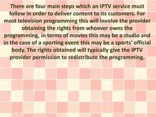 IPTV involves delivering audiovisual and other content over an IP-based network like the internet. For an IPTV service to work, the provider must obtain programming rights, encode the content, and distribute it over their network using sufficient bandwidth. Customers need a set-top box or other device to access the content through the provider's user interface, which typically includes an electronic program guide.