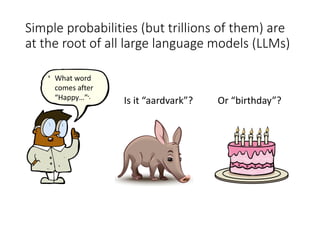 This document provides a technical introduction to large language models (LLMs). It explains that LLMs are based on simple probabilities derived from their massive training corpora, containing trillions of examples. The document then discusses several key aspects of how LLMs work, including that they function as a form of "lossy text compression" by encoding patterns and relationships in their training data. It also outlines some of the key elements in the architecture and training of the most advanced LLMs, such as GPT-4, focusing on their huge scale, transformer architecture, and use of reinforcement learning from human feedback.