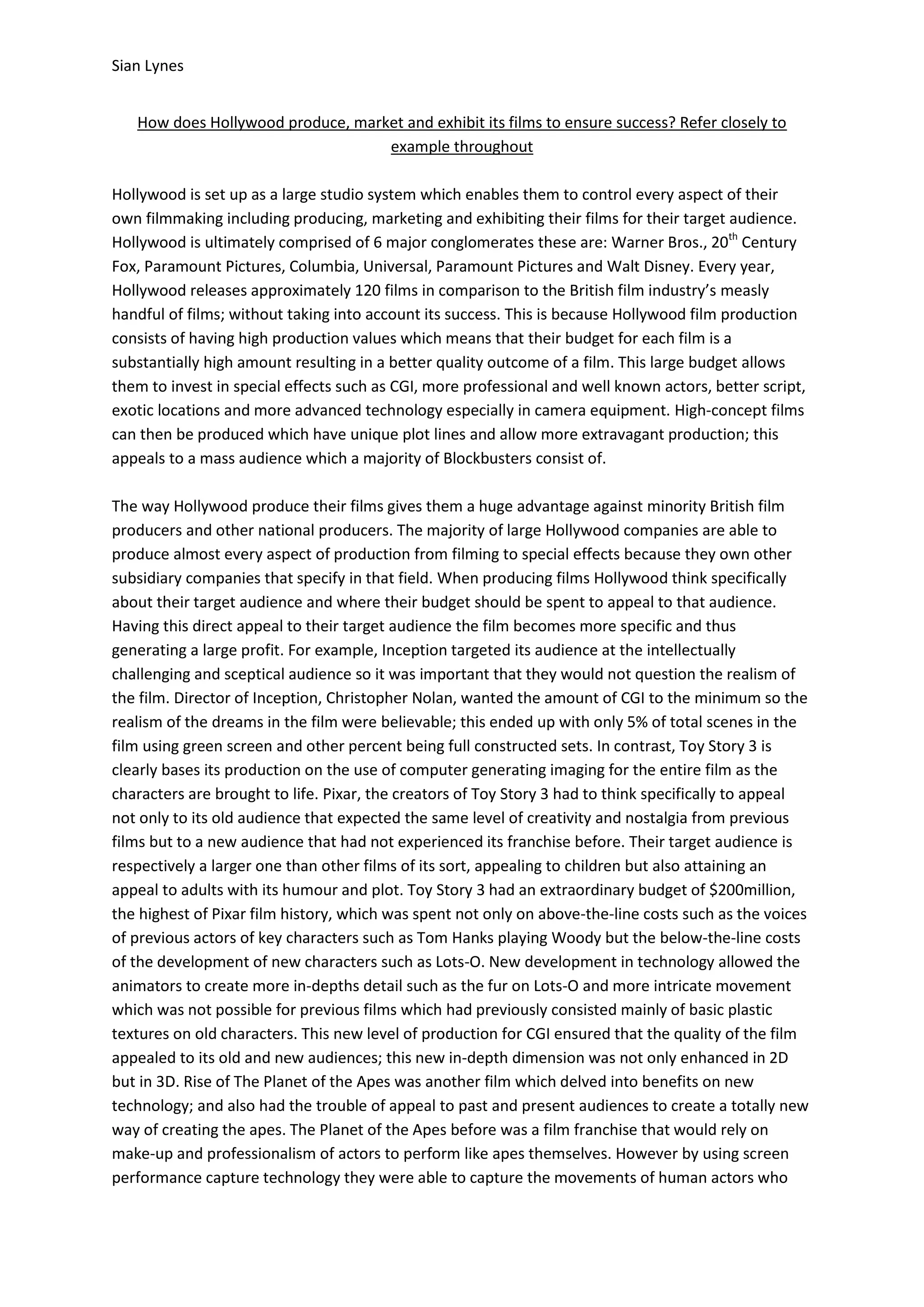 Hollywood has a large studio system that allows it to control all aspects of film production, marketing, and distribution. Major studios like Warner Bros. and Disney produce around 120 films per year with large budgets that allow for special effects, famous actors, and other elements that appeal to mass audiences. Hollywood carefully considers the target audience for each film and spends money accordingly. For example, Toy Story 3 had a $200 million budget to appeal to both new and returning audiences through advanced CGI. Hollywood also relies heavily on strategic marketing that builds hype online, like the viral marketing for Cloverfield. This level of production and promotion allows Hollywood films to be very profitable.