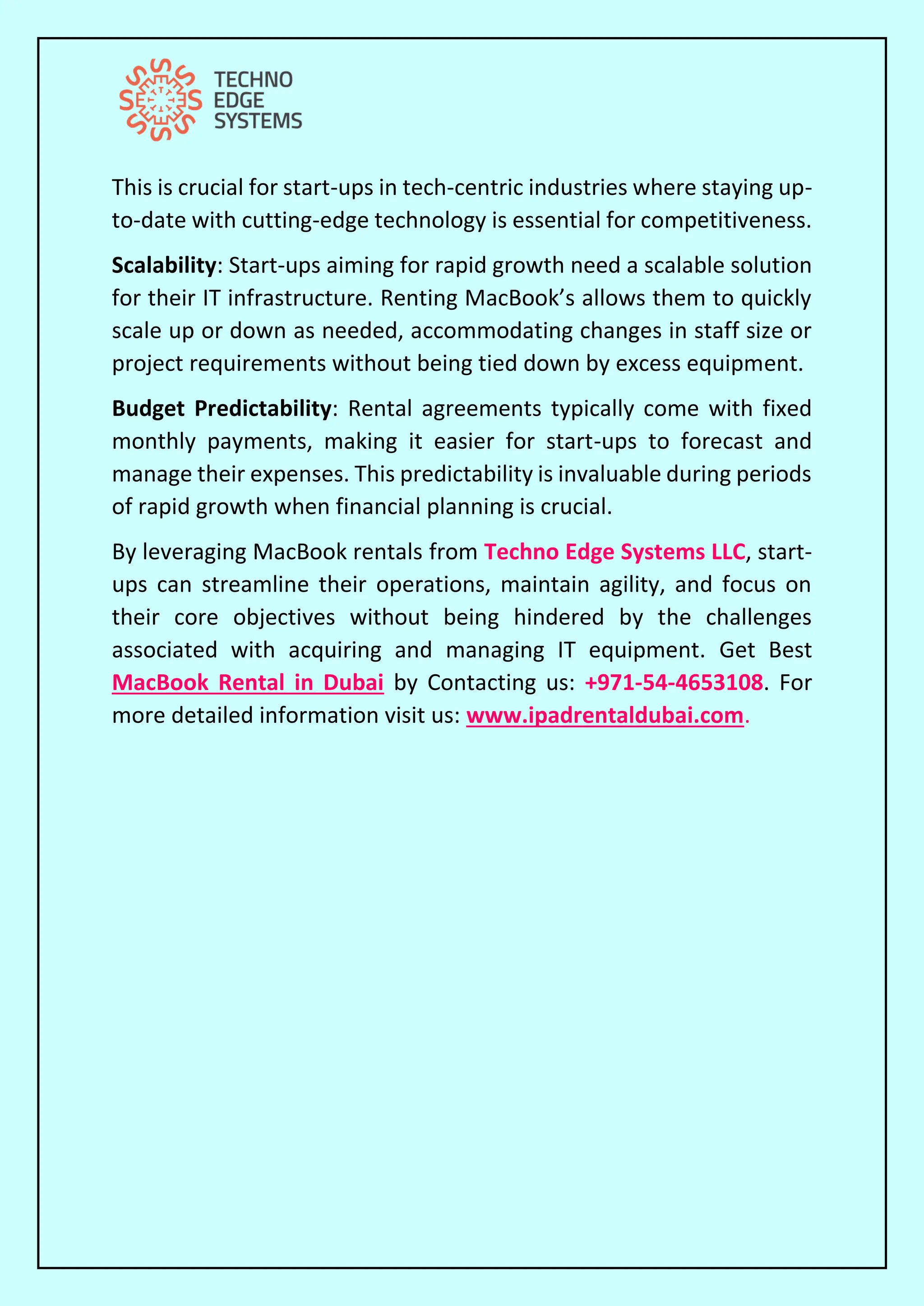 In this PDF, We discuss about MacBook rental aids start-ups' rapid growth by offering flexible, cost-effective access to latest technology, maintenance, and scalable solutions. Techno Edge Systems LLC offers the best MacBook Rental in Dubai. For More info Contact us: +971-54-4653108 Visit us: https://www.ipadrentaldubai.com/macbook-rental-dubai/