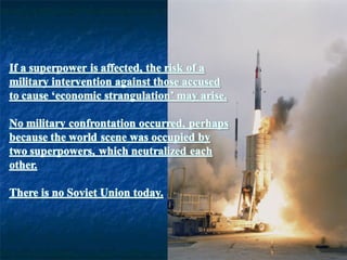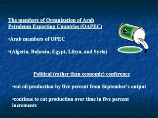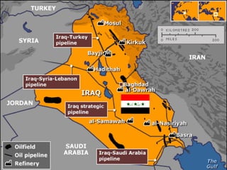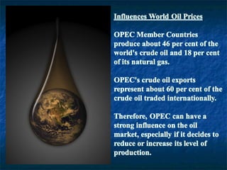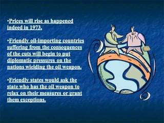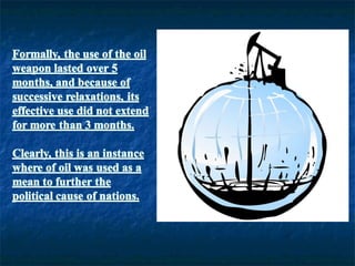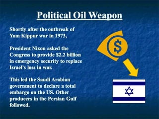 The document discusses how oil changed international politics in the 20th century by making the US dependent on foreign oil imports. It explores US strategies to decrease dependence such as drilling in ANWR, but notes constraints like high costs of domestic production and environmental concerns. It also examines the importance of the Persian Gulf as a major oil producer and exporter, and how conflicts in the Middle East impacted global oil prices and trade relations between oil producing and consuming nations.