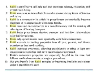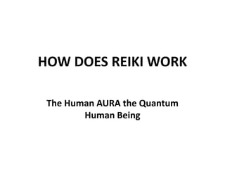 Reiki works by balancing the human aura and energy system, which can become disturbed or ruptured, leading to physical ailments. It brings balance through the natural energy received while sleeping and helps keep areas of the human energy system related to coping and happiness functioning properly. Reiki energy is absorbed as white light and broken down into rainbow colors, with each color relating to a specific life function area.