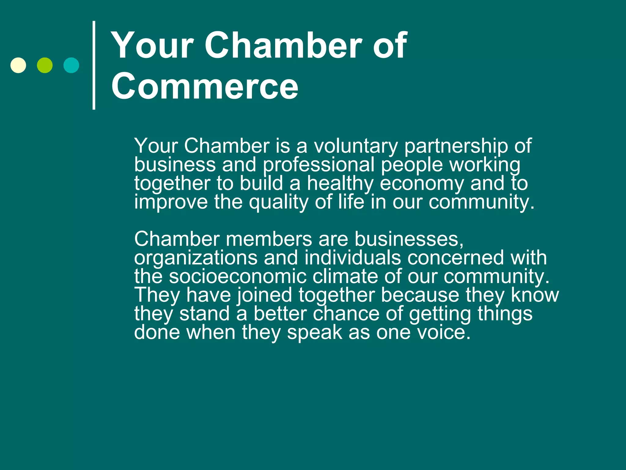 The Chamber of Commerce works to build a healthy local economy and improve quality of life through partnerships between businesses, organizations, and individuals. It helps members by speaking with one voice, enhancing the marketplace, and providing networking opportunities. The Chamber publishes a membership directory and relocation guide, advocates for legislative issues, and organizes events like a business expo to connect members and promote the local community.