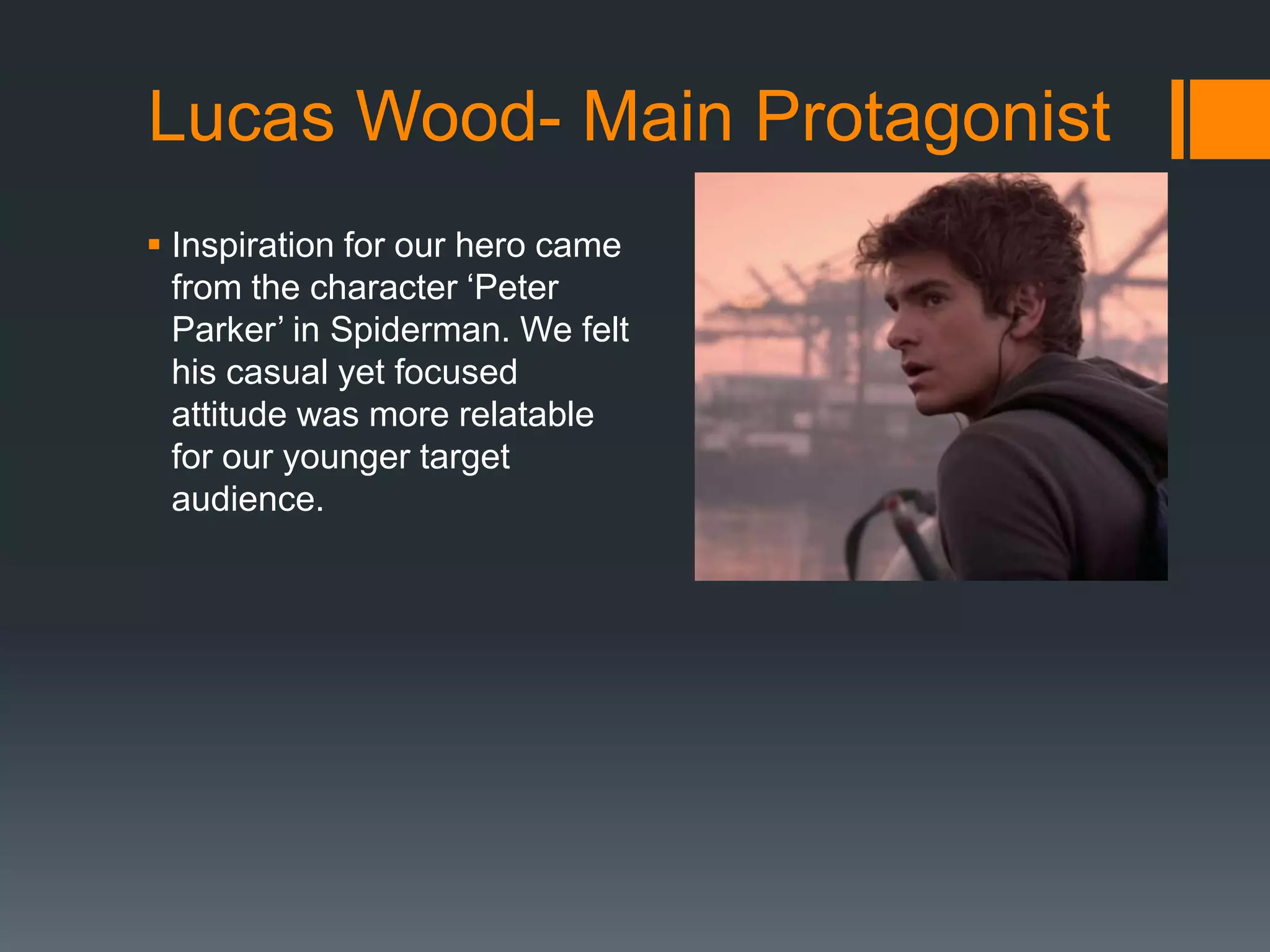 The document discusses how two main characters, Lucas Wood and Phil, are represented in a media product. Lucas is modeled after Spiderman's Peter Parker to seem more relatable to a young audience. Lucas demonstrates experience in his field while still appearing casual. Phil acts as Lucas' informant and occasionally gives him orders, making them equals. Their contrasting personalities cement their relationship. The product aims to counter stereotypes of flawless action heroes by showing Lucas' emotions during tense situations. Phil represents the computer geek stereotype through his clothing and large glasses, while the multiple computer screens around him suggest a reclusive nature.