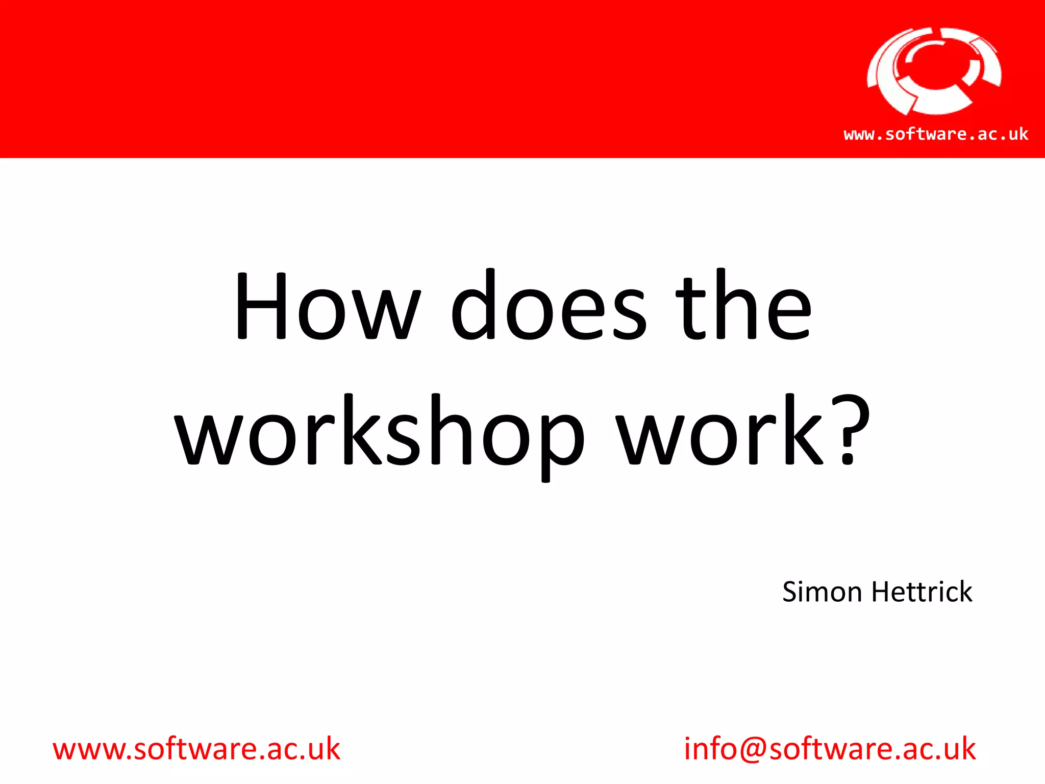 The document provides information about a workshop hosted at www.software.ac.uk, including details on how it works, the events team members, ways to provide feedback, announcements, an agents network, and collaborative ideas activities. Attendees are encouraged to meet new people, visit the website for information, email (but not attach) documents, and that the workshop is flexible.