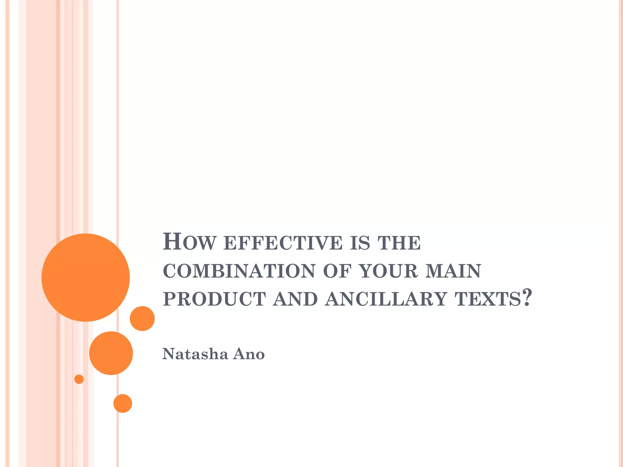 The document discusses the effectiveness of combining a main product (a short social realist film about gang culture) with ancillary texts (a film poster and film review). To create the ancillary texts, the author analyzed other similar film posters and reviews to identify conventions. The film poster design incorporates elements found in other posters like the main characters, quotes, and credits. The film review follows conventions like using action shots and a column format. All three products - the film, poster, and review - are closely linked to promote the film to their target audience and provide context, analysis and motivation for viewing.