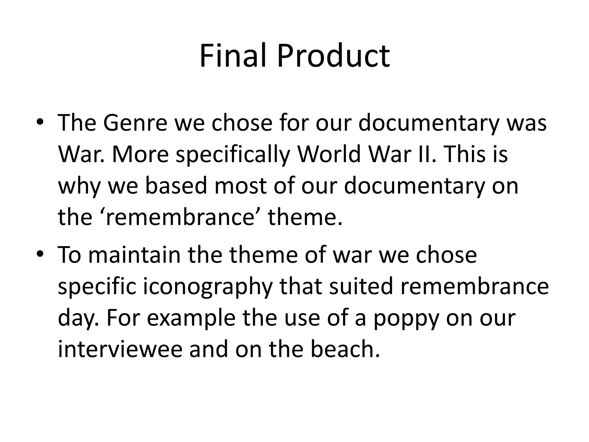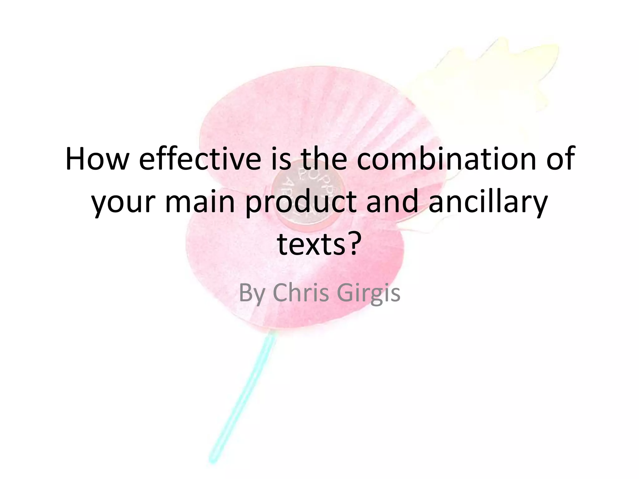 The document discusses the effectiveness of combining a documentary with ancillary print works. It summarizes that the documentary and print works all maintained the theme of remembrance through the use of consistent iconography like poppies. Research was conducted on layout and design of comparable works to achieve cohesion across formats. Elements like background, objects, and typography were kept consistent to clearly link the documentary with the double page spread and newspaper advertisement promoting it.