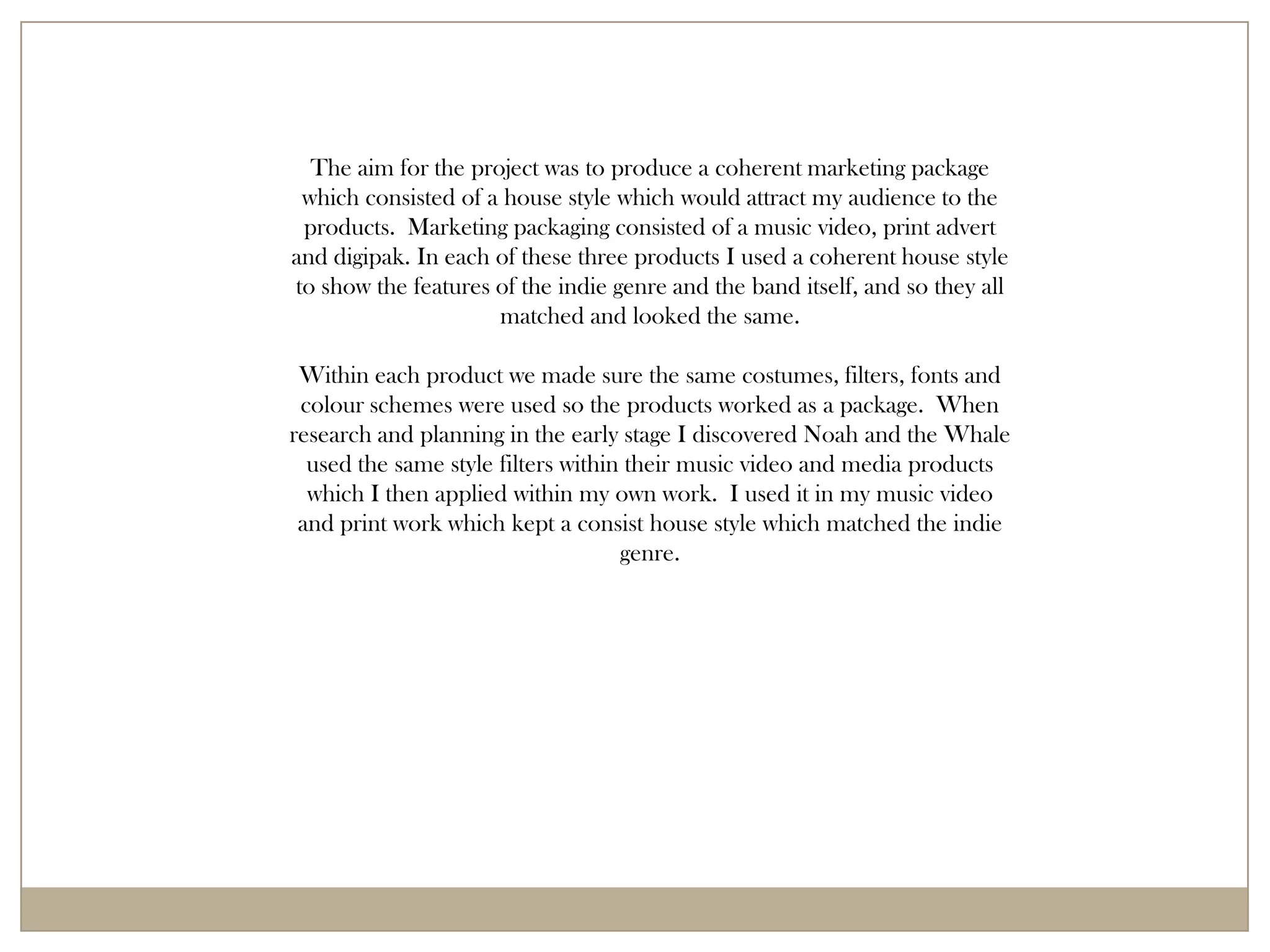The document discusses how the author created a coherent marketing package for an indie band that consisted of a music video, print advert, and digipak. The author used a consistent "house style" across all three pieces by employing the same costumes, filters, fonts, and color schemes. Research of other indie bands informed choices about filters, fonts, lighting, costumes, and props to represent the indie genre. Feedback from the target audience helped ensure the style and themes used would appeal to fans of the genre.