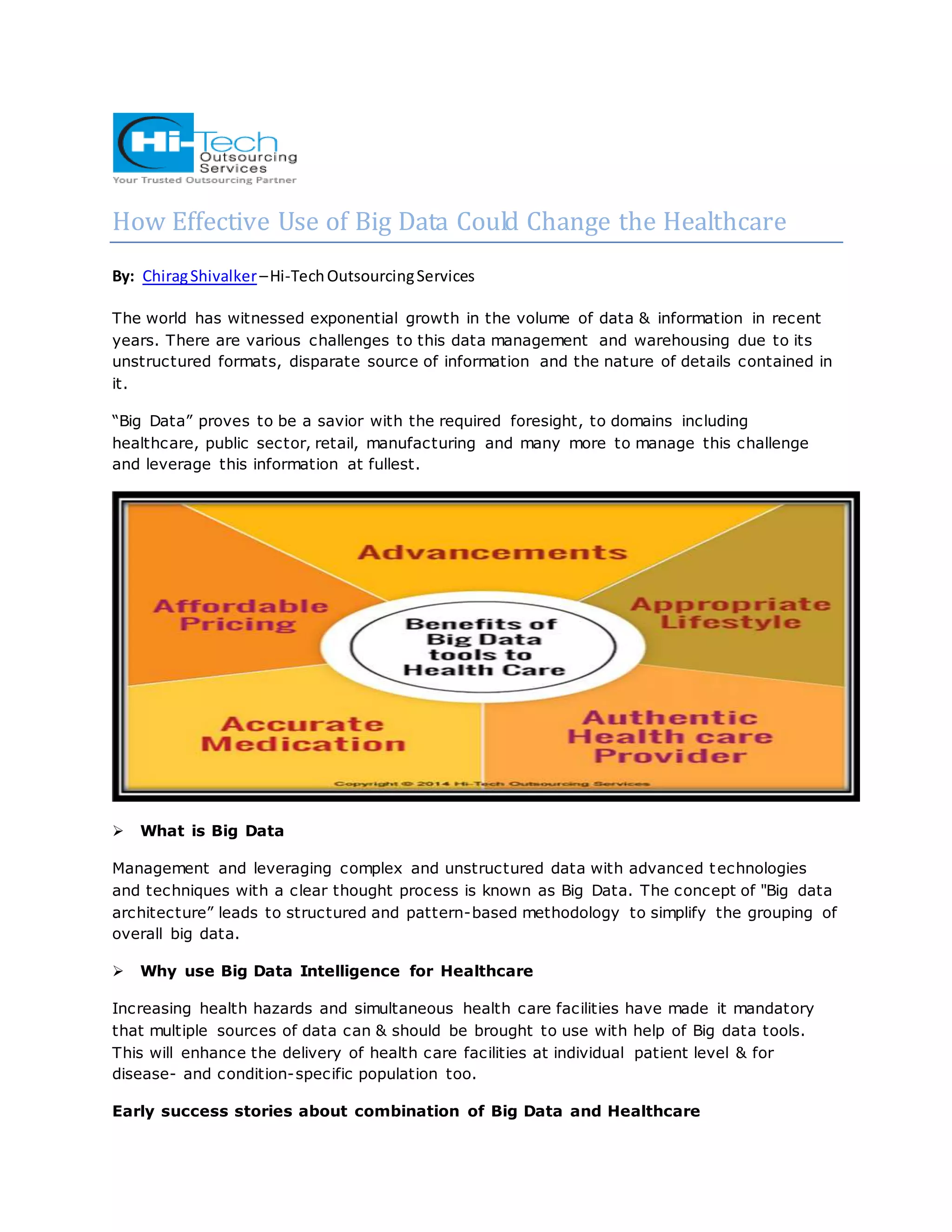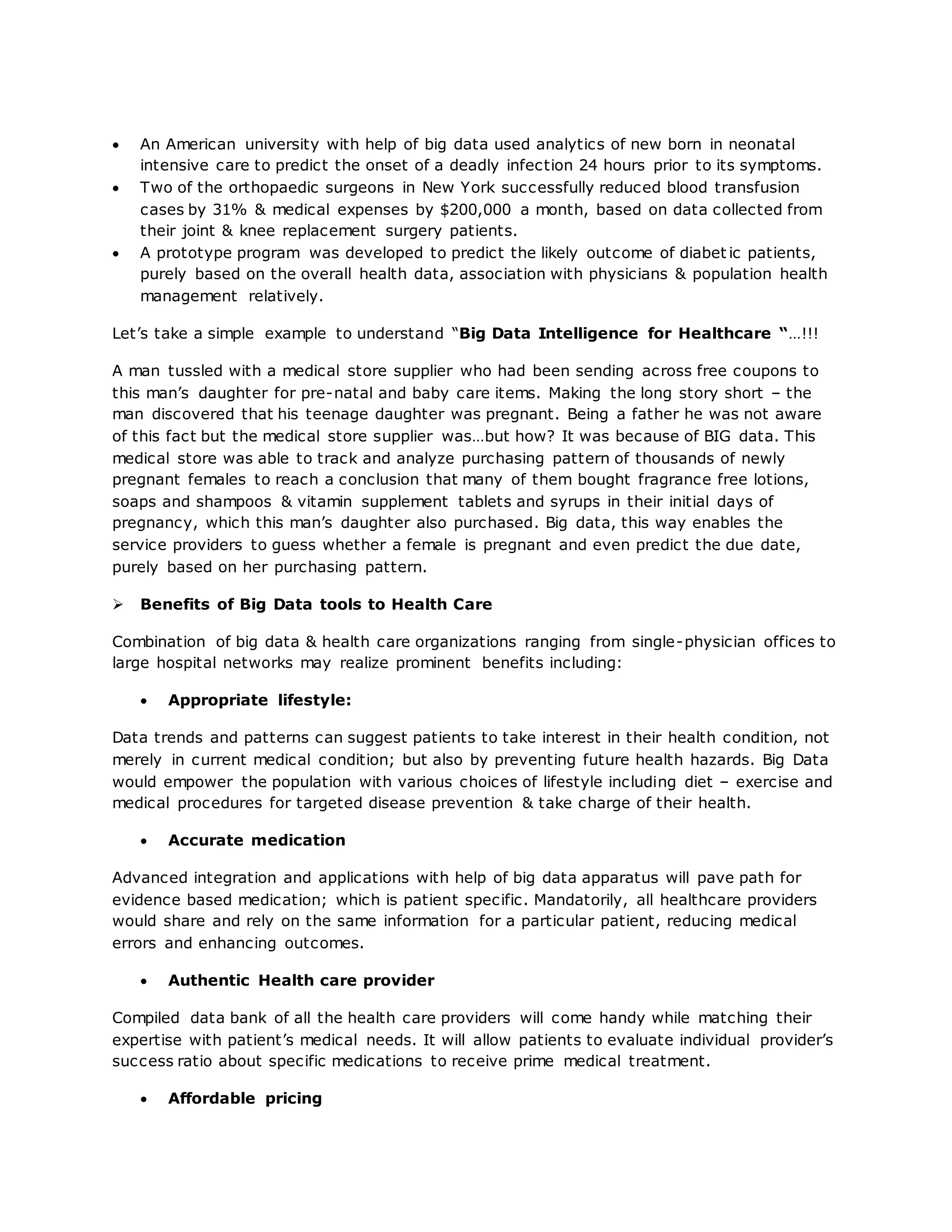 Big data has the potential to significantly improve healthcare by allowing analysis of large amounts of patient data from diverse sources. This can help predict disease onset, reduce medical costs, and improve treatment outcomes. By tracking purchasing patterns, big data already enables prediction of conditions like pregnancy. Widespread use of big data tools in healthcare could facilitate personalized, evidence-based care that improves lifestyle choices, medication accuracy, and lowers costs through reduced errors and waste.