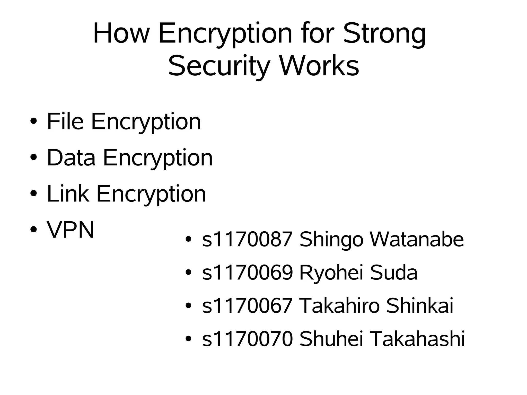 File, data, and link encryption as well as VPNs are described. File encryption encrypts files to protect them from being read or altered without a key. Data encryption hides data from other users by encoding it using a key into a pseudorandom stream. Link encryption encrypts all traffic at each end of a communications line. A VPN allows communication between systems using an existing shared network infrastructure.