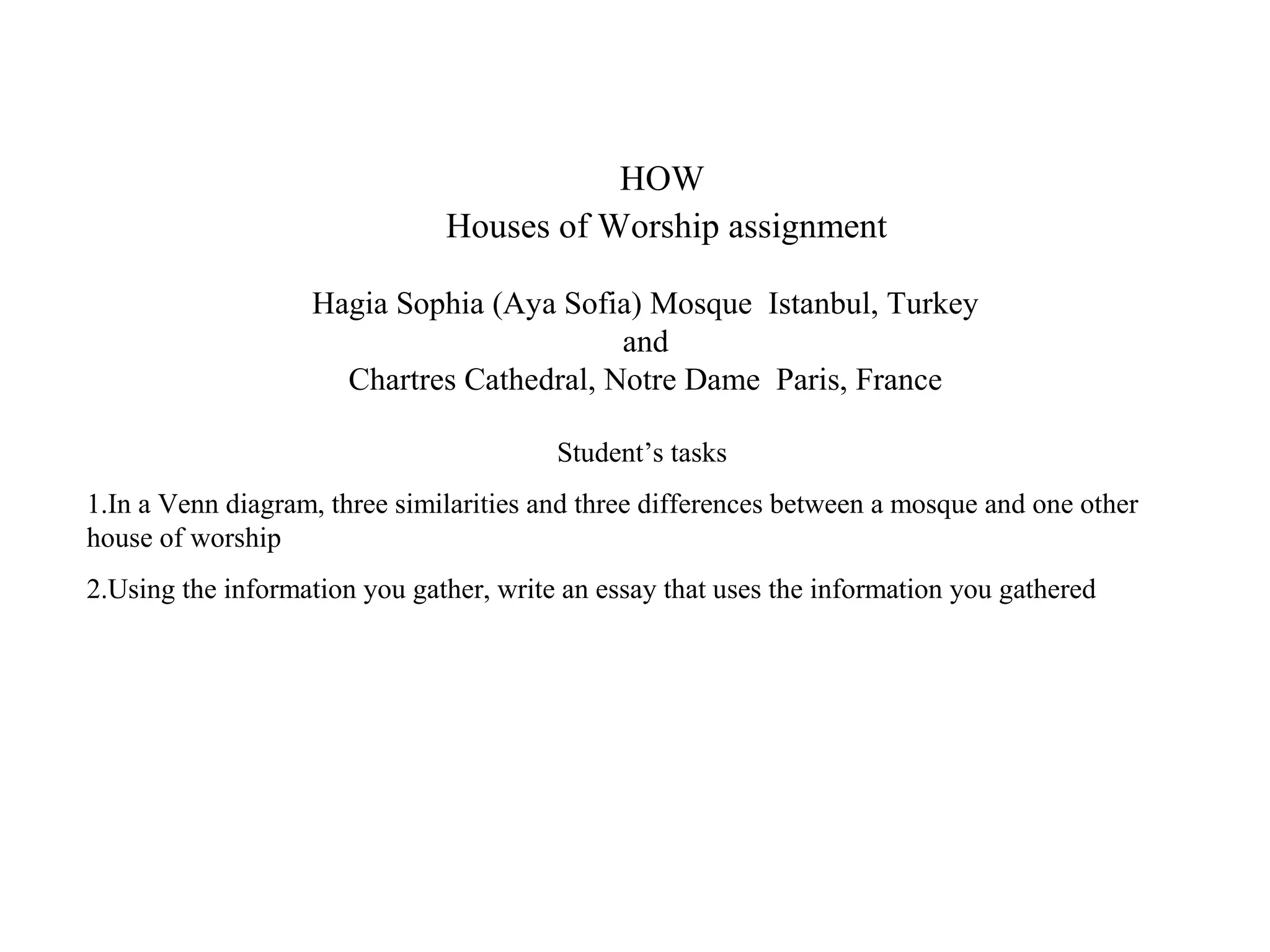 The document provides information about two important houses of worship: Hagia Sophia mosque in Istanbul, Turkey and Chartres Cathedral in Paris, France. It includes images and descriptions of the exterior and interior views of each building. The student is asked to create a Venn diagram comparing and contrasting three similarities and differences between a mosque and another house of worship. They are also asked to write an essay using the information gathered from comparing Hagia Sophia and Chartres Cathedral.