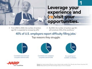 The document discusses how experienced workers aged 50+ are becoming increasingly important to the workforce. By 2022, workers aged 50+ will make up 35% of the workforce, increasing 62% since 2002. Employers value the experience, institutional knowledge, problem-solving skills, and reliability that experienced workers provide. Surveys find most employers believe experienced workers are valuable assets for training, mentoring, and addressing skills gaps. The document encourages experienced workers to recognize their strengths and rethink opportunities to remain engaged in the workforce.
