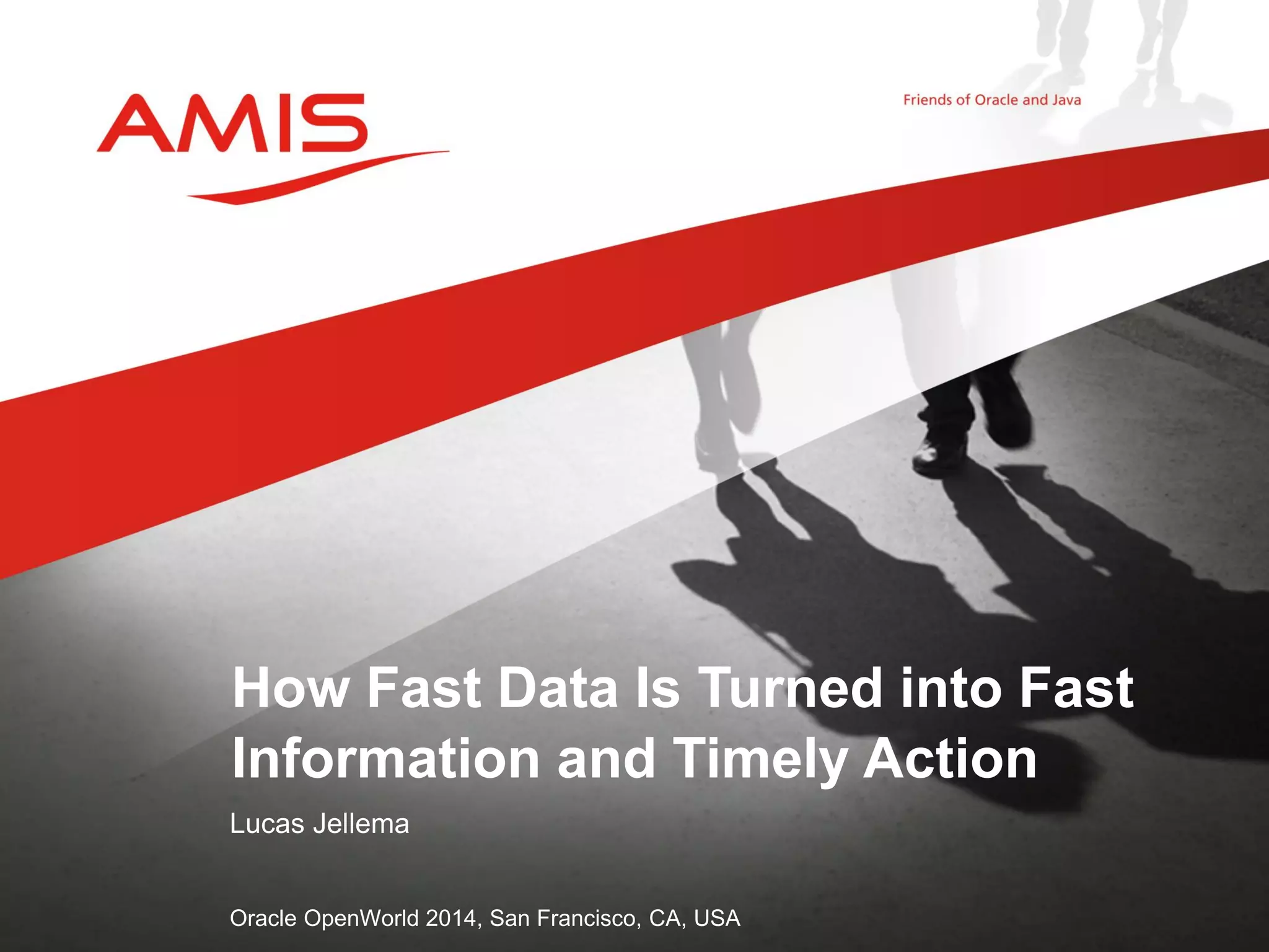 The document discusses the concept of fast data, emphasizing its characteristics of volume, velocity, variety, and the importance of timely actions. It outlines strategies for effective fast data processing, such as smart gathering, filtering, and pattern recognition, as well as tools like Oracle Event Processor. Demonstrations showcase applications of fast data in various scenarios like tennis tournaments, car park management, and credit card theft detection.