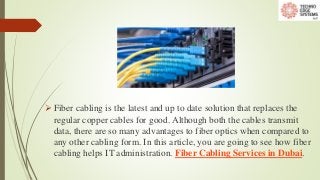 The fiber cabling companies they used to maintain separate servers or drives to store the required data for business. Fiber Cabling Services in Dubai is providing the best possible services and technical assistance in this field. To get the best possible service, you can make contact with Techno Edge Systems LLC. Call us on +971-54-7914851.