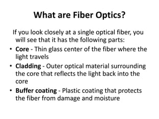 Fiber optics work by transmitting light through thin glass cores surrounded by cladding that reflects light down the core. Light travels through the core via total internal reflection off the cladding. Fiber optic systems include transmitters that encode light signals, optical fibers that carry the signals long distances, and receivers that decode the signals. Key advantages of fiber optics are lower costs, higher data capacity, non-flammability, smaller size, less signal degradation, and ability to carry digital and light signals with low power needs.