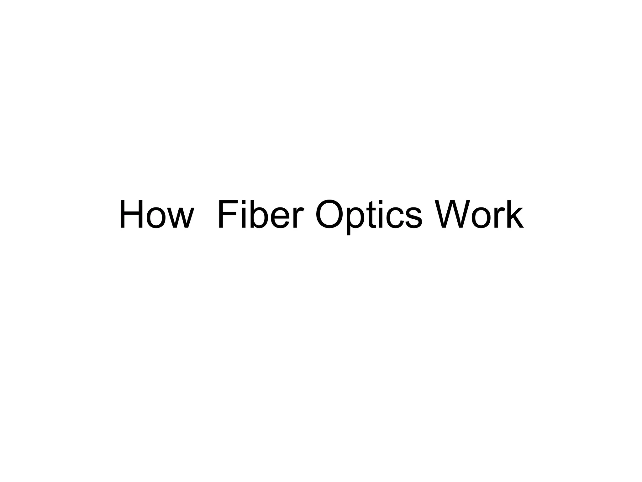 Fiber optics work by guiding light down thin glass or plastic strands using internal reflection. Light entering one end of the fiber bounces off the inner walls and emerges from the other end. Historically, naval ships communicated using signal lights and Morse code. Optical fibers are made of extremely pure glass with few impurities to allow light to pass through. Fiber optics have advantages over copper wires including lower cost, higher data capacity, less signal interference between fibers, lower power needs, and suitability for digital networks.