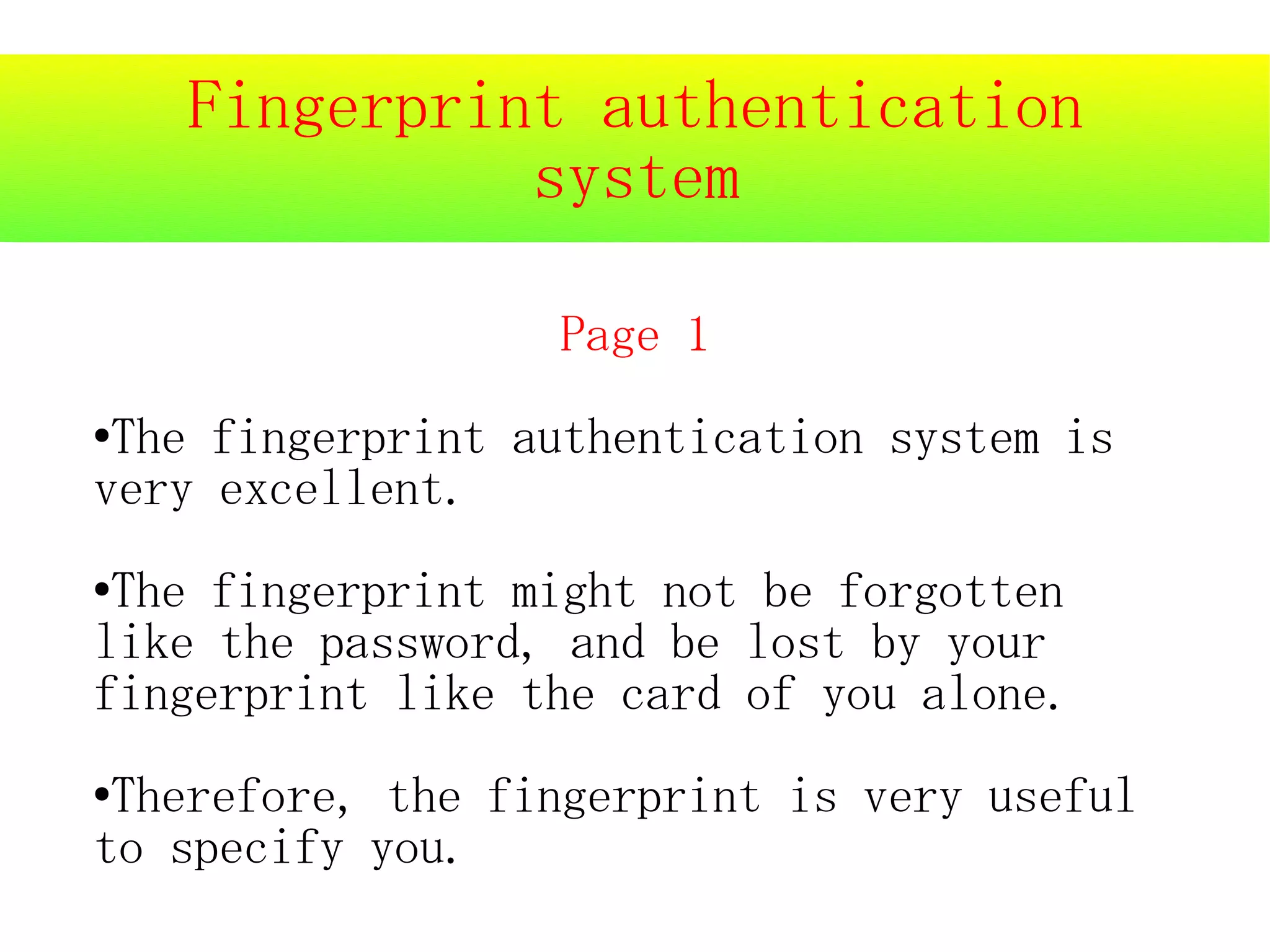 The fingerprint authentication system uses an individual's unique fingerprint to verify their identity. It scans fingerprints using light reflection or voltage reading to recognize fingerprint patterns. While fingerprints are very useful for identification as they cannot be forgotten or lost like passwords, the system is not perfect and may sometimes struggle to distinguish between fingerprints or be fooled by cutting and using someone else's finger.