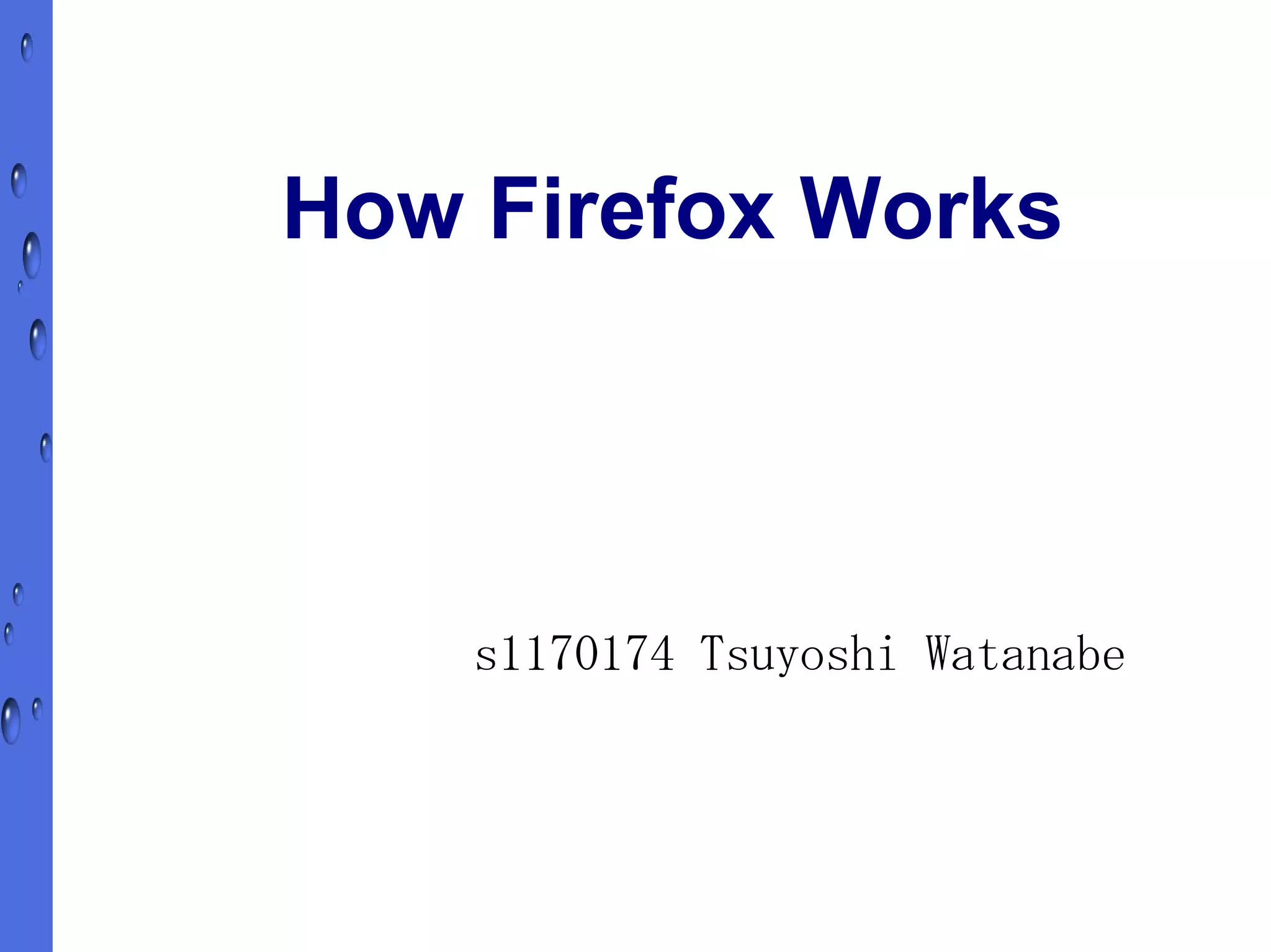 Firefox is a web browser with roots in Netscape. It can be downloaded from its official website for free. While Firefox looks similar to other browsers, it offers advantages like tabbed browsing, a pop-up blocker, and compatibility with multiple operating systems. Firefox can also be customized through extensions that change its appearance or block ads. The article discusses Firefox's security compared to Internet Explorer and ongoing development of new Firefox versions with improved interfaces.