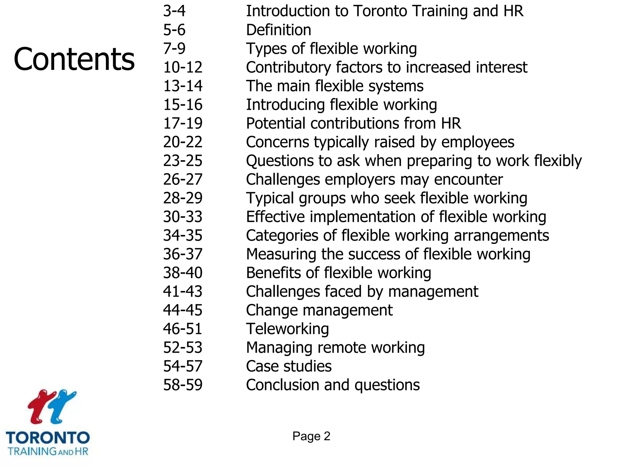 The document discusses flexible working arrangements and provides definitions, types of flexibility, factors driving increased interest, challenges for employers and employees, and how to effectively implement flexible working. It examines benefits like improved recruitment and retention as well as challenges such as managing remote employees and organizational culture changes. The document serves as a guide for understanding and setting up flexible work programs.