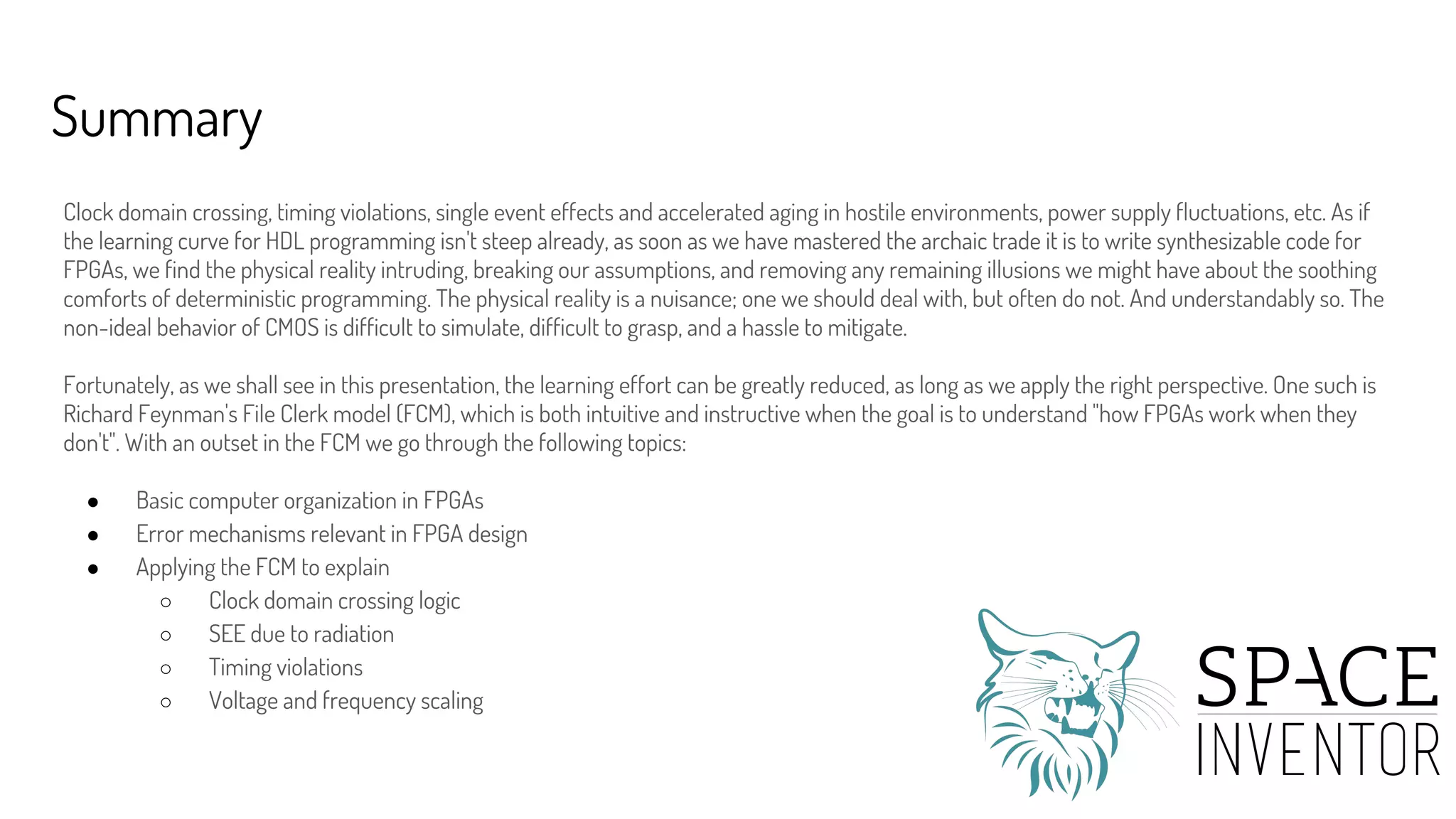 The document discusses how FPGAs can fail due to timing violations even when programmed correctly. It introduces Richard Feynman's "File Clerk Model" (FCM) as an intuitive way to understand these failures. Using the FCM analogy, the presentation explains how timing violations can cause errors by sensitizing logic and generating transient "maybe" states. It also discusses specific error cases like clock domain crossing and radiation-induced aging. The overall message is that timing constraints are crucial for reliable FPGA operation, and the FCM provides system-level insights into how timing errors can occur.