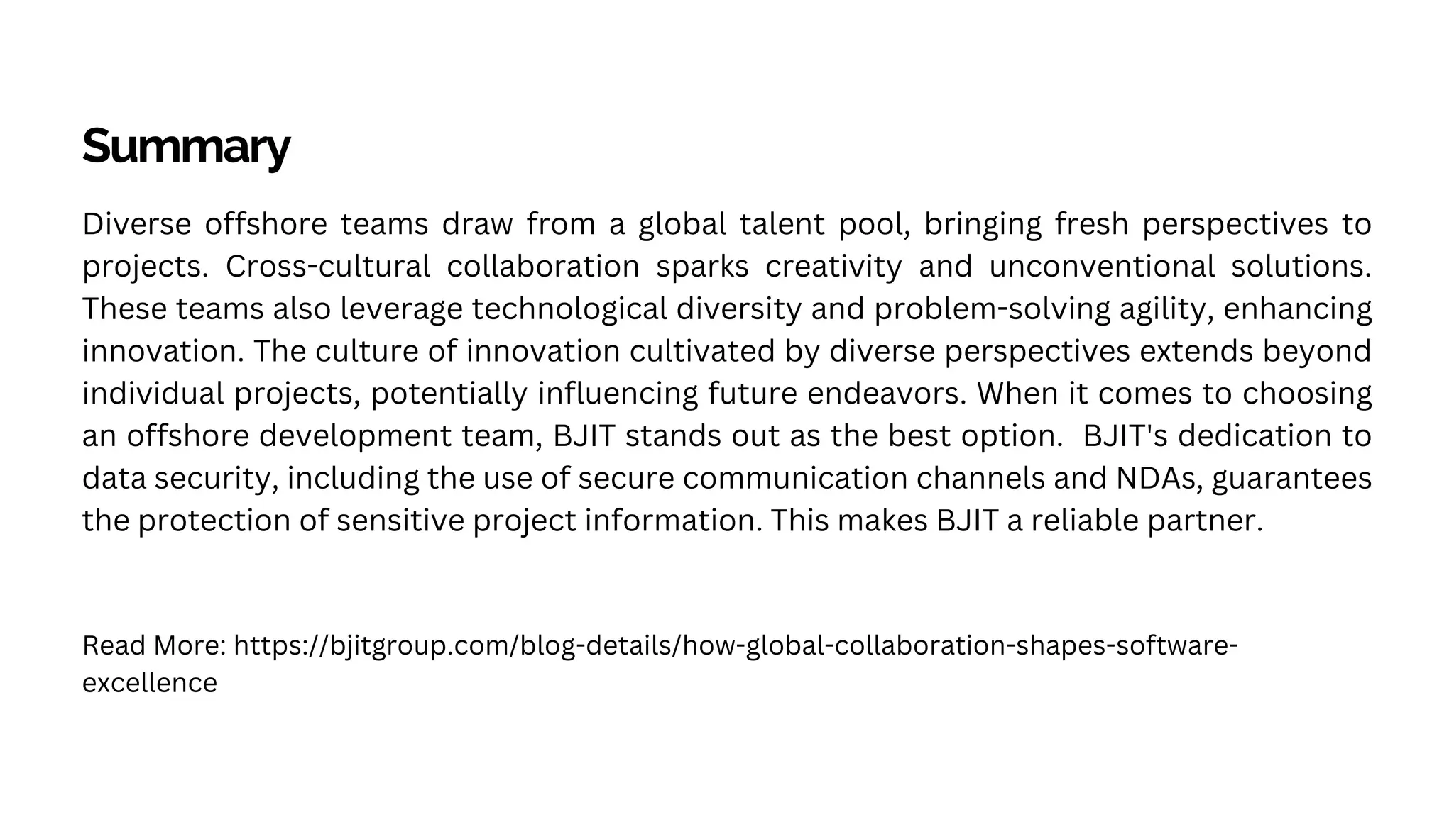 Global collaboration in software development enhances innovation by tapping into diverse talents and perspectives from around the world. The ability to utilize time zone differences allows for continuous development, accelerating project timelines and improving quality assurance processes. BJIT is highlighted as a reliable offshore development partner, known for its commitment to data security and excellence in delivering software solutions.