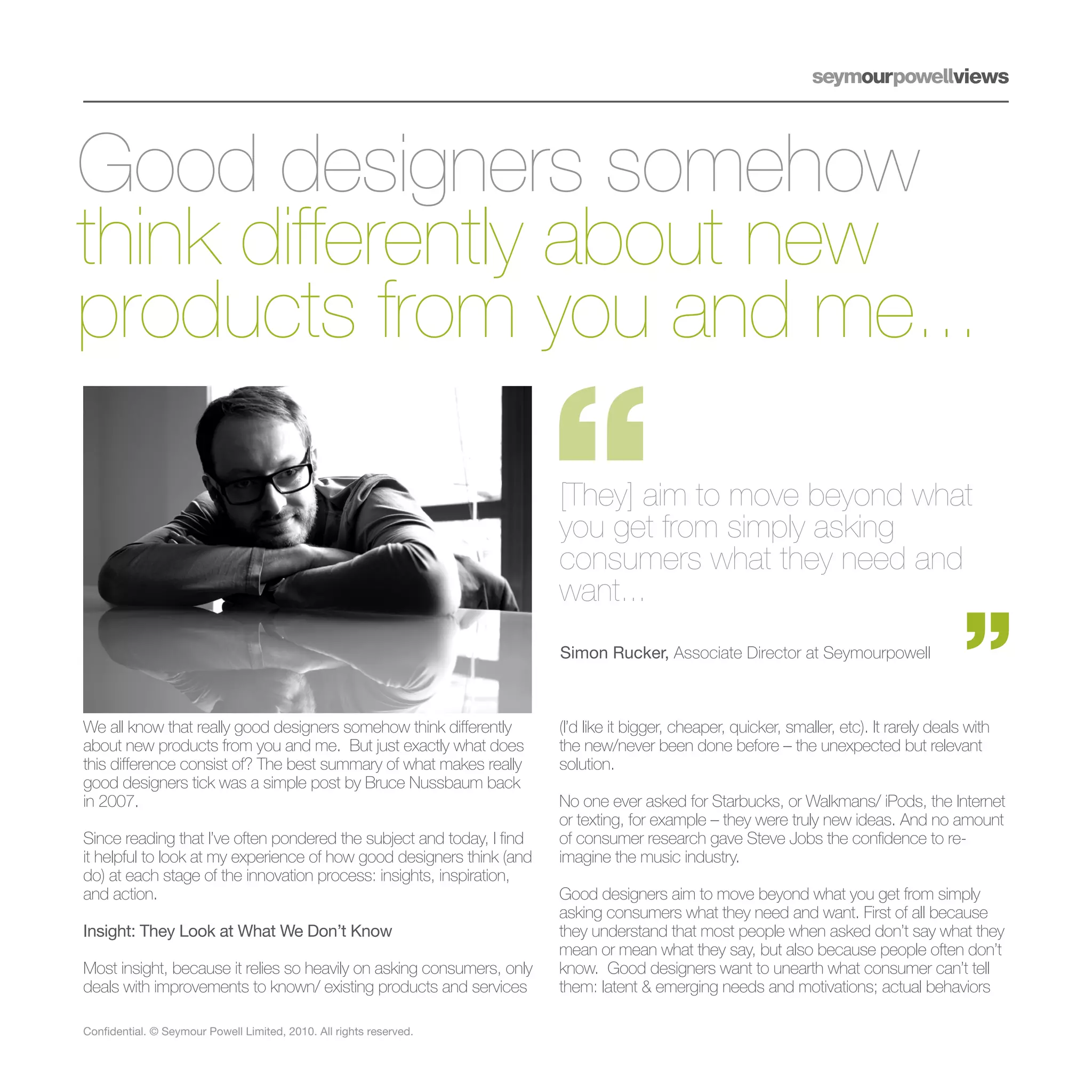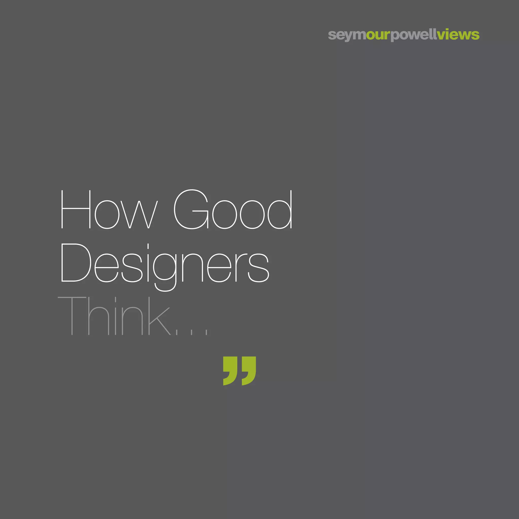 Good designers think differently by seeking insights beyond consumer requests, focusing on latent needs and behaviors. They successfully integrate diverse expertise, observe behaviors, and envision future trends to transform ideas into tangible products. Their process involves collaboration, iterative prototyping, and a commitment to realizing innovative concepts.