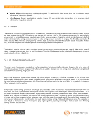 The document analyzes the accuracy of company-issued earnings guidance compared to analyst estimates, finding that companies are generally more accurate, especially when providing positive guidance, which tends to surprise analysts. The stock price responses to guidance announcements show that positive guidance yields a 2.6% excess return while negative guidance leads to a 1.3% loss, indicating that the market reacts differently based on the nature of the guidance. Overall, while company guidance informs market expectations, analysts refining their estimates based on this guidance can produce even more accurate results.