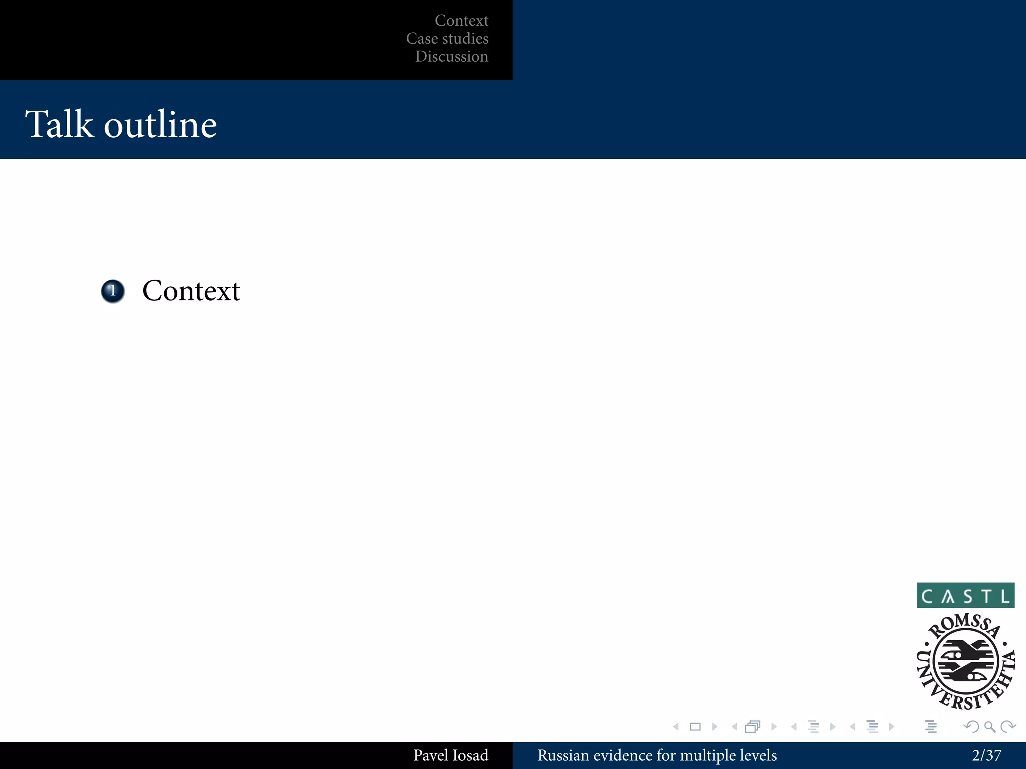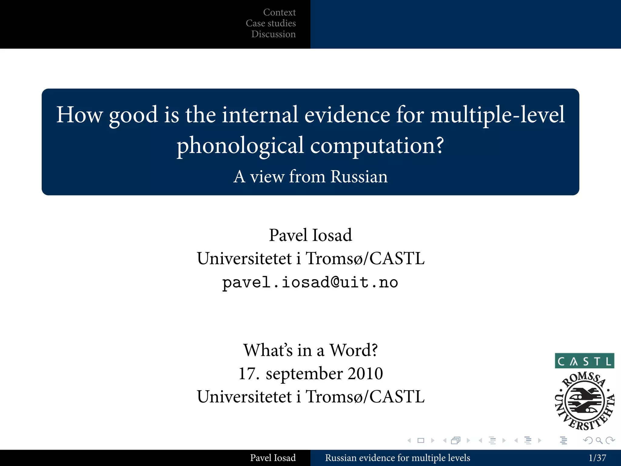 This document outlines Pavel Iosad's talk on evidence from Russian phonology for multiple levels of representation. The talk introduction provides context on Russian's importance in the history of generative phonology. The outline then lists the main sections: context, case studies from Russian including palatalization and backness switch, the value of internal evidence, and why internal evidence is not enough. The document includes slides with phonological examples and analyses from Russian.