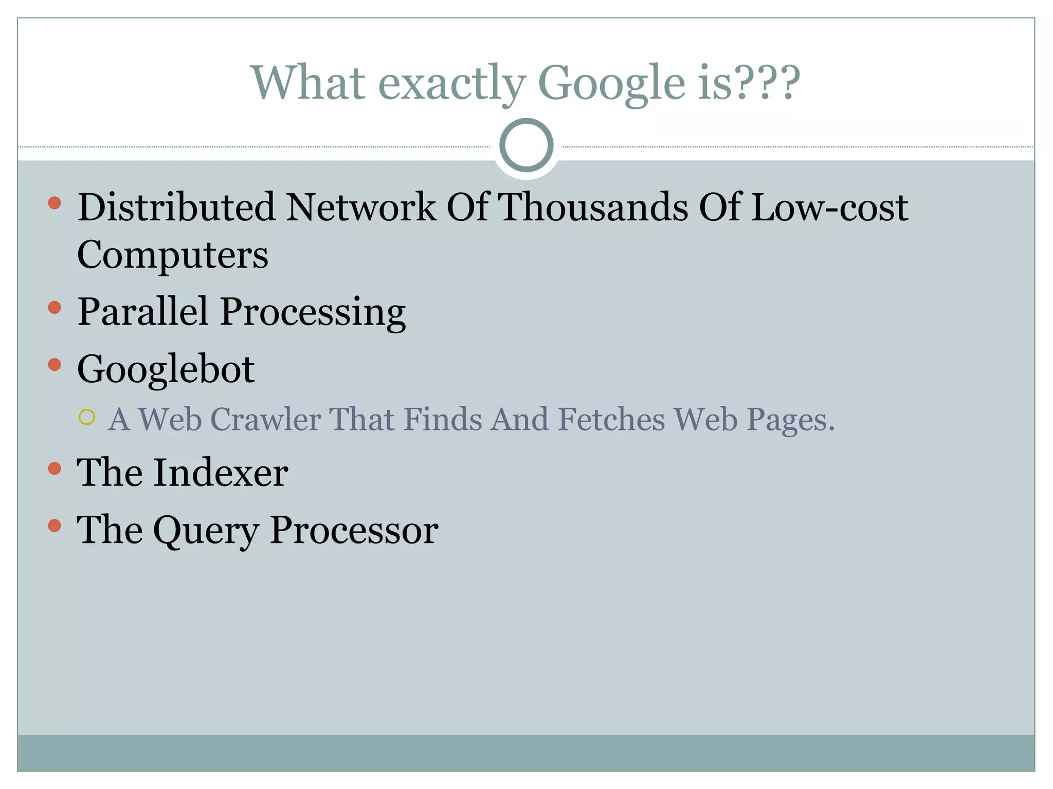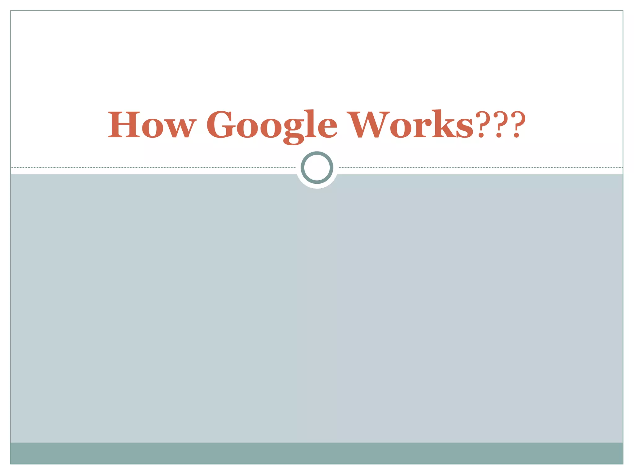 Google works by using thousands of computers that crawl the web, index pages, and process search queries in parallel. Googlebot, Google's web crawler, fetches web pages from across the internet and hands them off to Google's indexer. The indexer then creates an alphabetical index of terms found on each page along with their locations. When a user searches, Google's query processor matches the terms to results from the indexer and returns relevant pages within seconds.