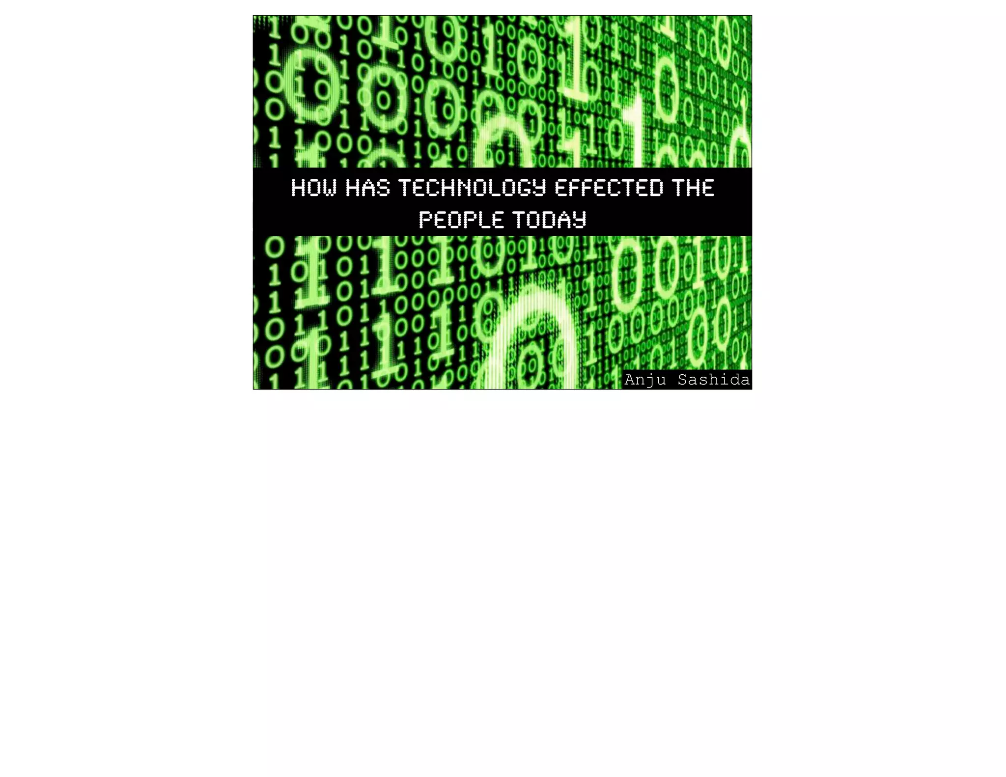 Technology has made things that were previously impossible now possible and has made our lives easier. Three key technologies that have affected people are email which allows for fast, easy, and free worldwide communication including attachments and messages; mobile phones which enable texting, apps, and accessing the internet anywhere, anytime including for photos; and the internet which provides easy access to information, entertainment, research, and social networks as well as online shopping. While technology has changed how people live their lives today compared to the past, it is debated whether this is entirely a good thing.