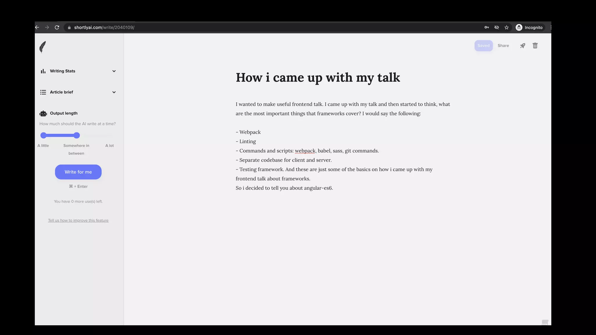 The document describes the process by which someone decided on a topic for their presentation. They initially considered topics like animations or differential equations. After seeing an animation example, they wanted to create one themselves from 0 to 1, but struggled for over a day to get the math right. They eventually landed on an exponential function that achieved the desired animation effect over time. They questioned why they went through so much effort to figure this out.