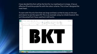 I designed a masthead for a publication by finding a large, basic font in purple that fits the color scheme. I took a screenshot of the font, pasted it into a publishing program as a picture so I could remove the background. I then found a space background image, layered it behind the font cutout, and removed the white background to create a masthead with the font over the space image.